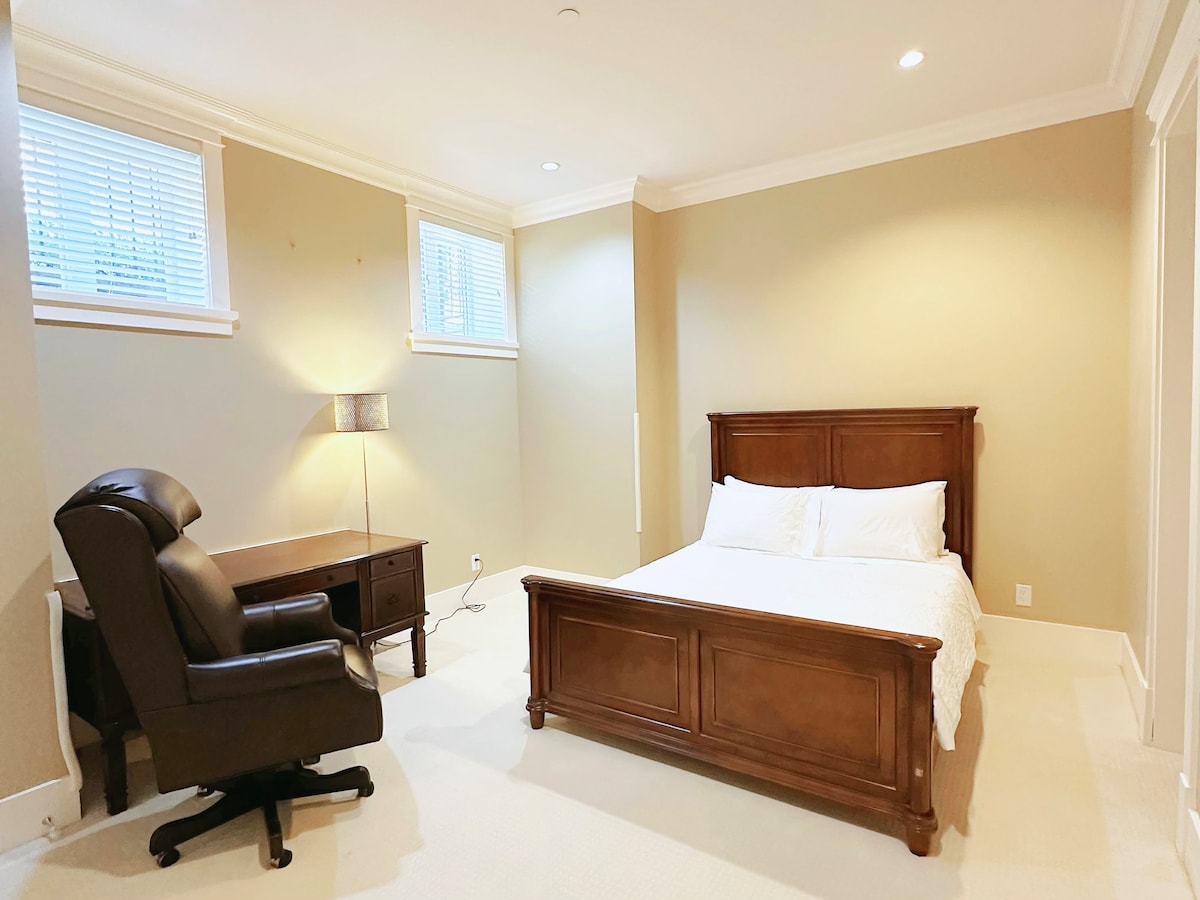 Profitez d'un séjour élégant dans ce logement central. Grande, belle, calme et propre chambre proche de tout. À distance de marche facile de plus de 100 restaurants, centre commercial et deux grandes épiceries. 10 minutes à pied de la station de métro aérien. 10 minutes en voiture de YVR. Lit Queen Size et canapé-lit. Salle de bain complète et cuisine complète. Entrée privée. Veuillez noter que, étant proche de l'aéroport, vous entendrez les avions aller et venir. C'est aussi ma maison. Bienvenue chez moi.
