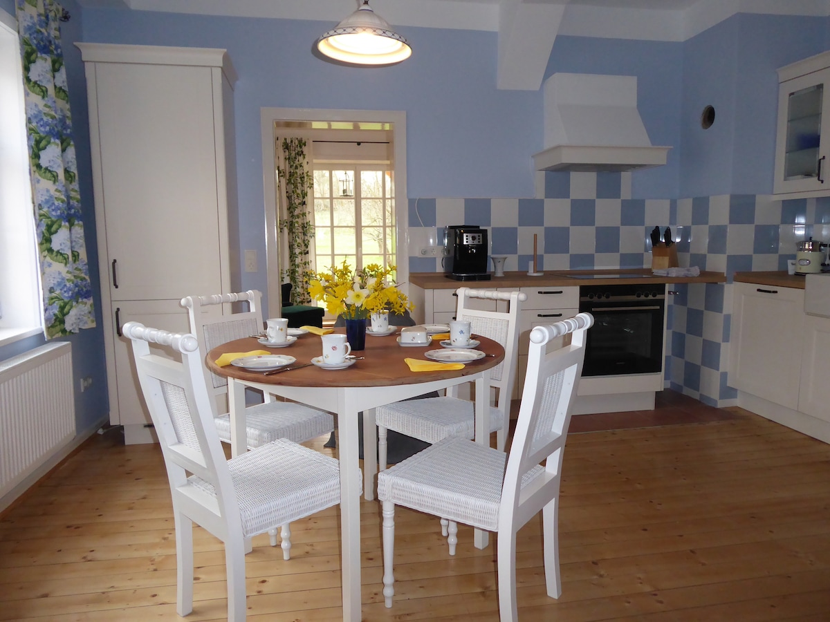 Cet appartement confortable d'environ 37 m² a été rénové avec beaucoup d'amour et beaucoup de matériaux de construction naturels, de sorte que le charme qu'une si vieille maison peut dégager n'a pas été perdu. Il offre aux hôtes une ambiance très confortable dans un jardin paradisiaque idyllique. Des places de parking gratuites sont disponibles juste devant la maison. Des vélos peuvent également être loués. Divers commerces se trouvent à proximité immédiate et sont accessibles à pied.