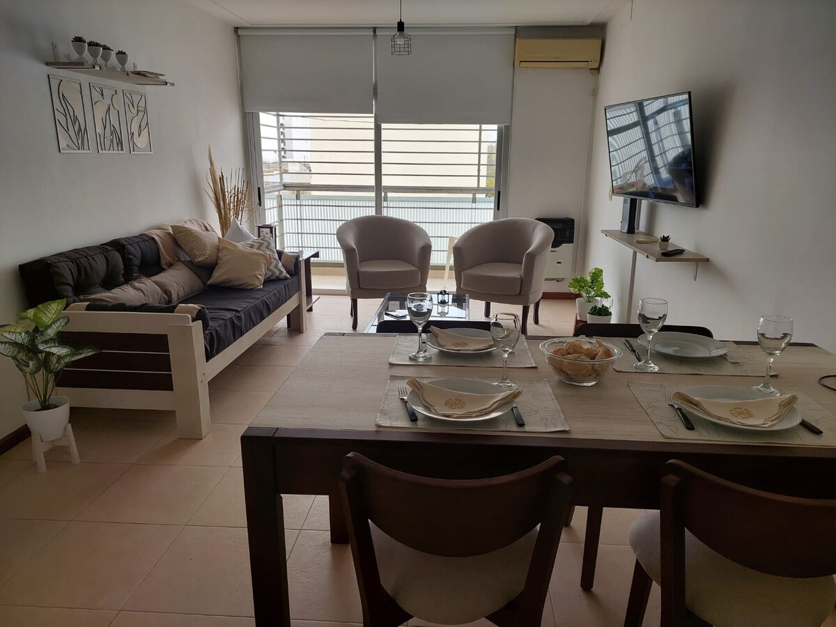 Logement avec tout ce dont vous avez besoin pour que vous vous sentiez comme chez vous. Avec garage pour voiture moyenne, dans le même bâtiment. Si vous voyagez avec un bébé, nous avons un stage. Celle qui est proposée sur demande. Situé dans le macro centre de Rio Cuarto, à seulement 11 pâtés de maisons de la Plaza Roca. L'appartement donne sur l'avant (balcon) et est accessible par ascenseur ou par escalier.