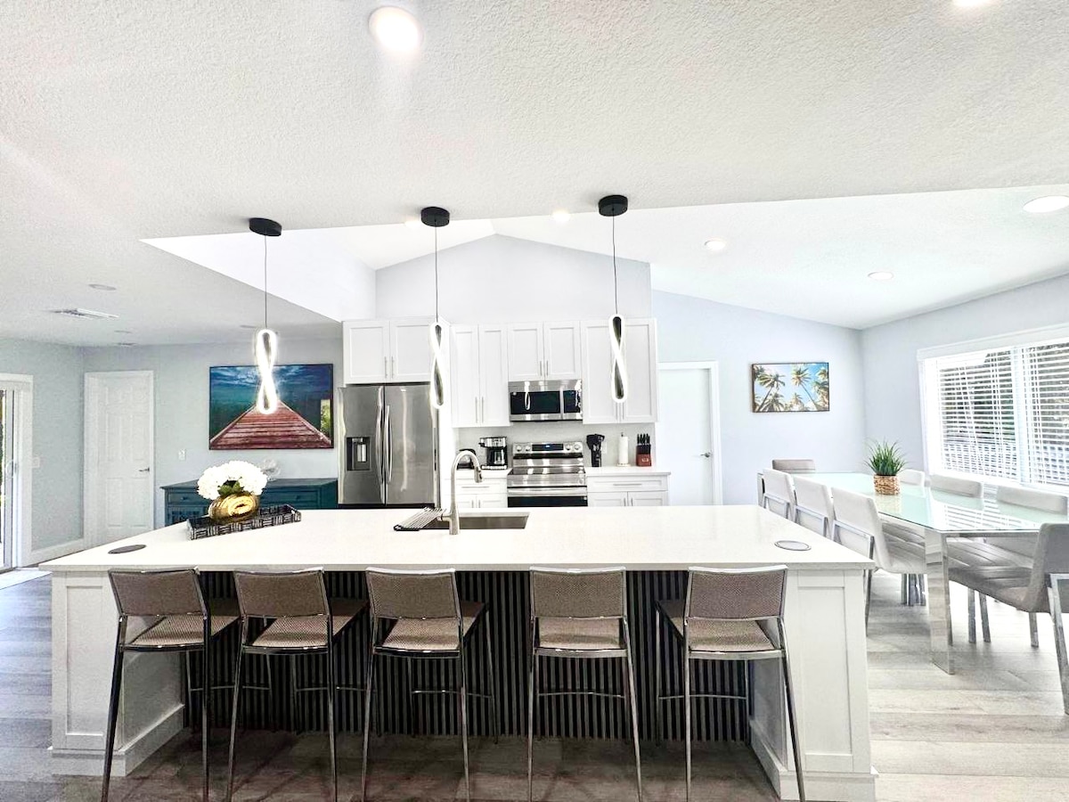 Cette maison est parfaite pour les grands groupes ou quiconque recherche une atmosphère spacieuse et relaxante. Idéalement située entre Miami, Orlando et Tampa, la maison se trouve à seulement 15 minutes en voiture de la plage. C'est une maison fonctionnelle et belle, avec un salon confortable et une cuisine ouverte avec un grand îlot, de hauts plafonds, un porche et un incroyable foyer. Les amis apprécieront l'espace de divertissement du garage qui comprend un jeu de fléchettes, un baby-foot, un piano et d'autres jeux. Un lit pour bébé est fourni.