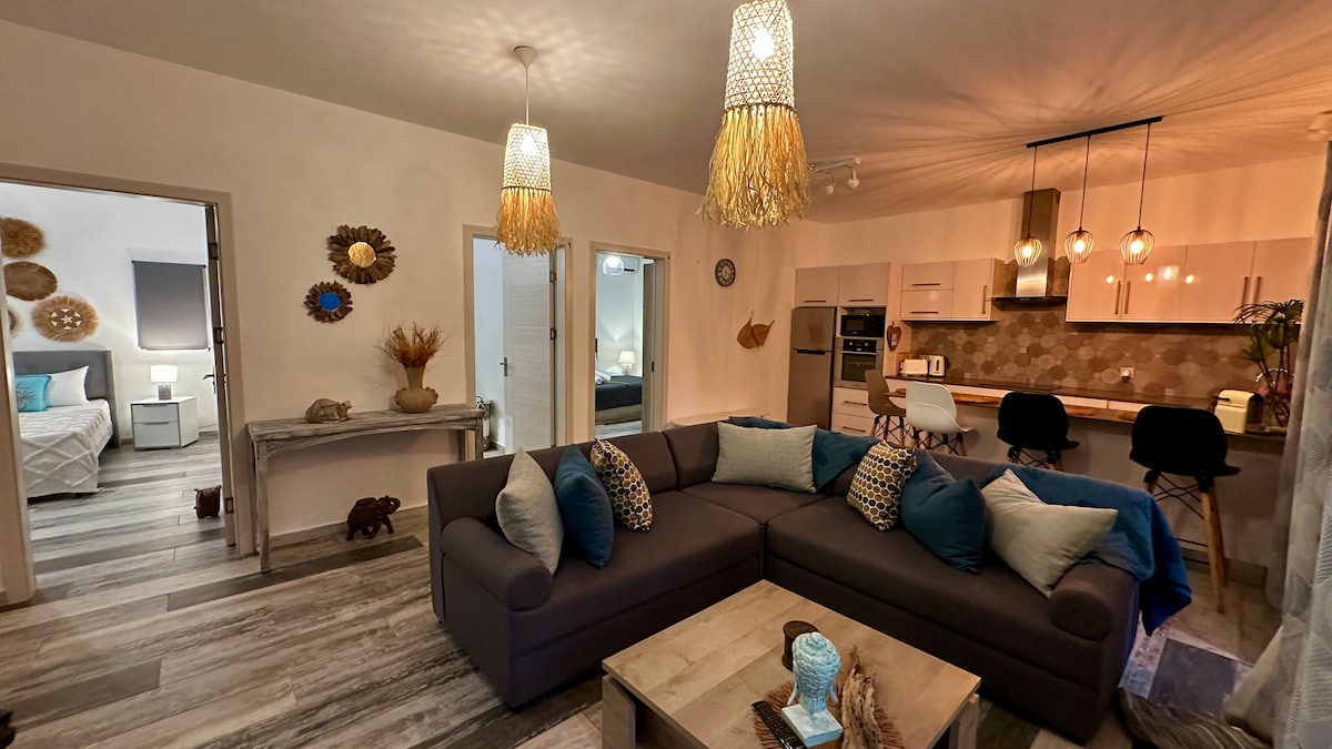 Votre appartement au 1er étage dans une nouvelle petite maison d'hôtes. Il dispose de 2 chambres, 2 salles de bains, un salon, une cuisine et un patio privé. Vous pourrez profiter de la piscine chauffée sur le toit, de la salle de sport et de la table de pique-nique. Situé à proximité des plages privées et des hôtels-boutiques. L'appartement dispose d'une grande terrasse privée avec barbecue, de sièges extérieurs et d'un accès à une deuxième cuisine et un deuxième espace extérieurs. Les restaurants et hôtels locaux sont à quelques pas seulement. Climatisation dans toutes les pièces. Le Point aux Canionniers se situe entre la plage de Mont Choisy et Grand Baie.