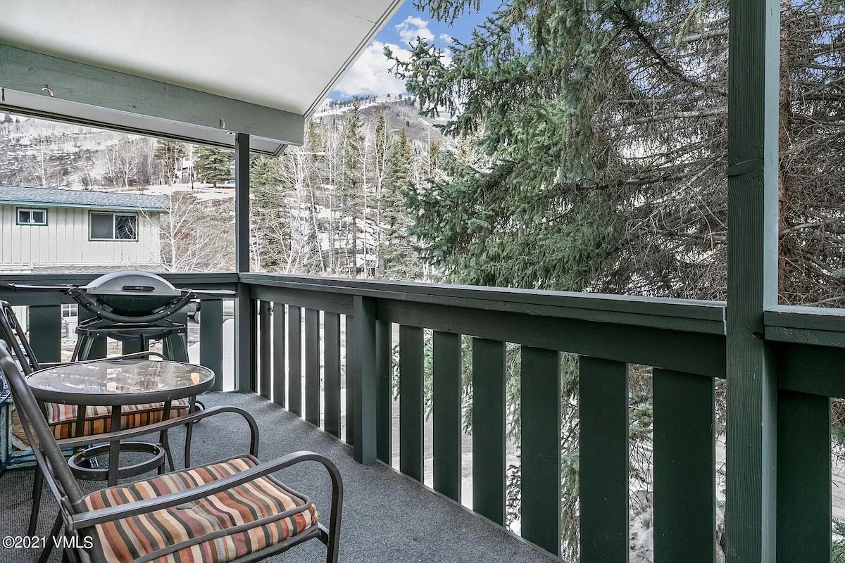 Fabulous Lionshead location w/ VIEWS of mountains & gondola from every room! Walk across the pedestrian bridge to Lionshead Village or jump on the FREE Town of Vail Shuttle that stops across the street from the condo. Beautifully remodeled, top floor condo includes private deck w/ bbq, free wifi, gas fireplace & convenient, reserved free parking. Near hiking, biking & golf. Newer carpet, tile & paint. 936 square feet. Enjoy the Rocky Mountains at your home away from home near Lionshead!