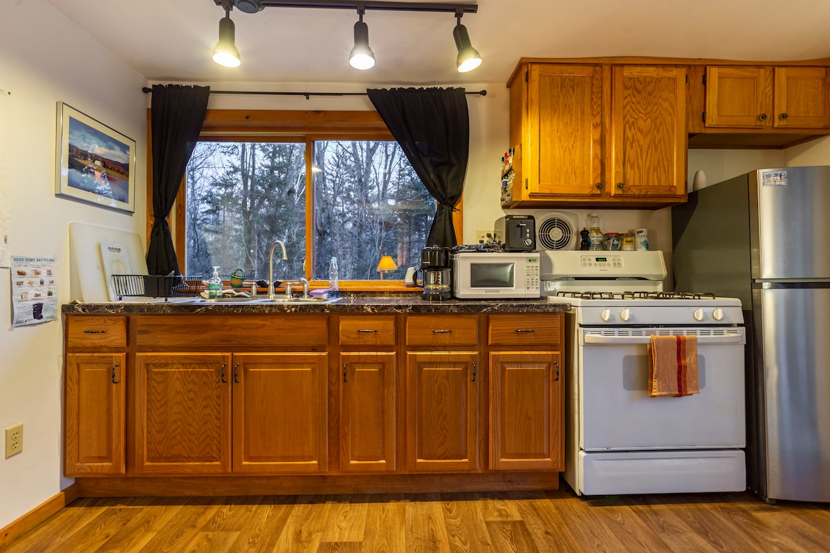 Veuillez noter que pendant les mois d'hiver, vous devrez peut-être monter Winterberry Lane et notre allée si vous n'avez pas de véhicule à quatre roues motrices avec de bons pneus à neige. Appartement de deux chambres au cœur du Vermont. Piste de motoneige située à côté de la voie. Raquettes, randonnée ou VTT depuis la porte. Emplacement privé calme avec entrée indépendante et parking sur place. Rampe d'accès à l'appartement, avec accès sans escalier. Étang, vues et situé dans le centre de l'État, un excellent point de départ !