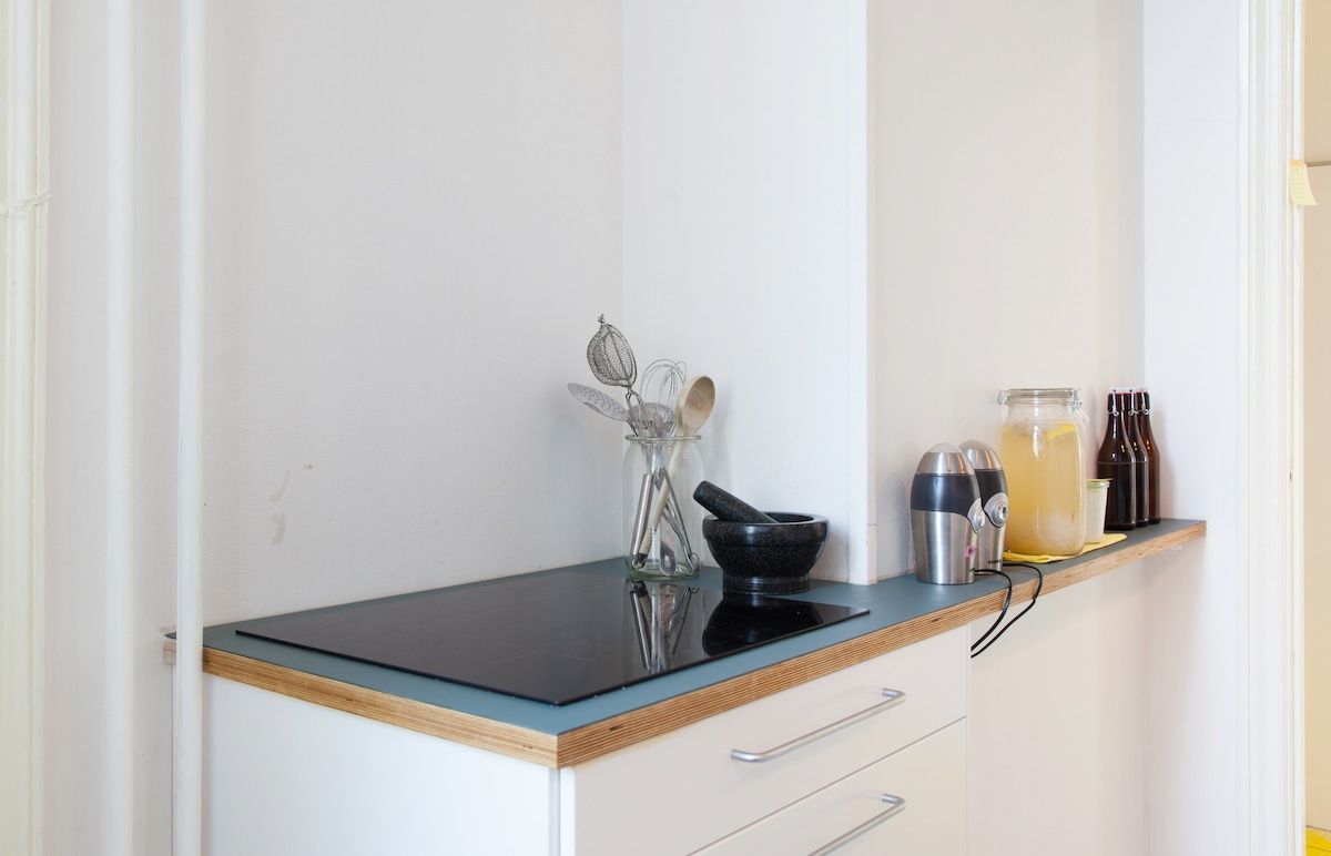 Appartement d'une chambre, grand lit, balcon - parfait pour un couple/deux personnes. Tout récemment rénové, y compris la salle de bain et la cuisine simple avec lave-vaisselle. Draps, serviettes, etc. inclus, télévision 55"et connexion Wi-Fi gratuite. Situé au 5e étage – vous ferez votre exercice quotidien et disposerez d'un appartement lumineux au sommet de l'immeuble – veuillez noter qu'il n'y a pas d'ascenseur. Jolie cour arrière. Très central, il peut donc y avoir un peu de bruit dans la rue. Malheureusement, pas de climatisation.
