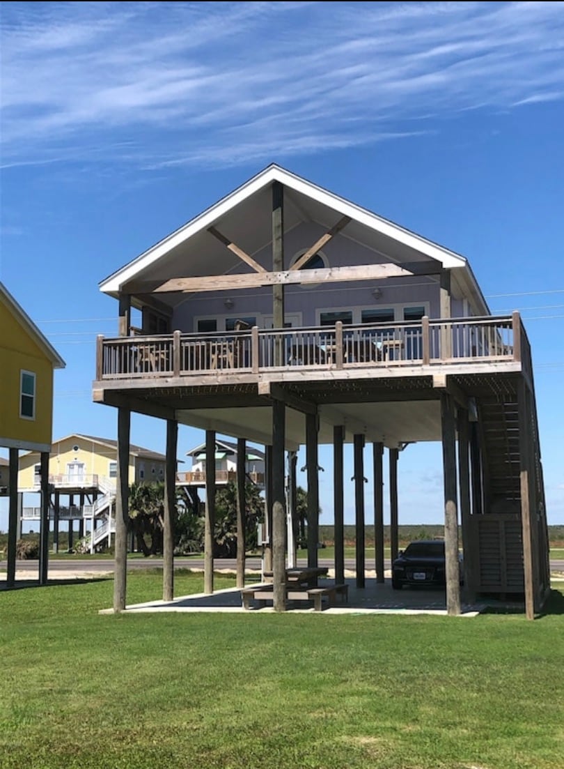 Escape to this bright coastal retreat on Bolivar Peninsula. Enjoy an open living space with soaring ceilings, panoramic windows, and a fully equipped kitchen. Relax on the spacious deck or unwind in the shaded hangout area below. Just steps from the beach in a charming neighborhood of colorful homes—perfect for families, friends, and beach lovers seeking a peaceful Gulf getaway. ⭑About the Area⭑ Bolivar Peninsula, TX—enjoy the laid-back coastal lifestyle with the beach just steps away.