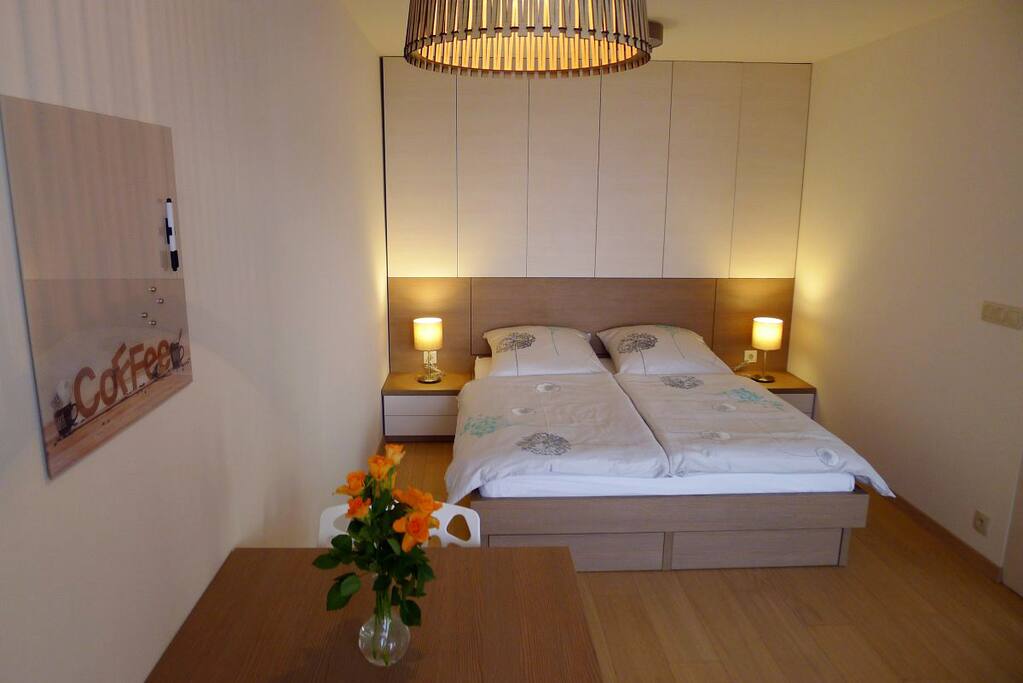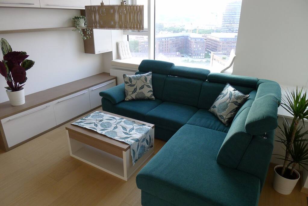 Our cosy fully furnished new apartment (39 m2) with a small loggia is located in the centre of Bratislava, just 2 minutes on foot from the new National Theatre, Eurovea shopping mall and Danube river promenade with plenty of restaurants, cafés and bars. It is within walking distance from historical city centre (10 min.). It has air conditioning and parking in building garage is included in the price. There is a convertible sofa for 3rd guest and a TV with 120 channels and internet connection.