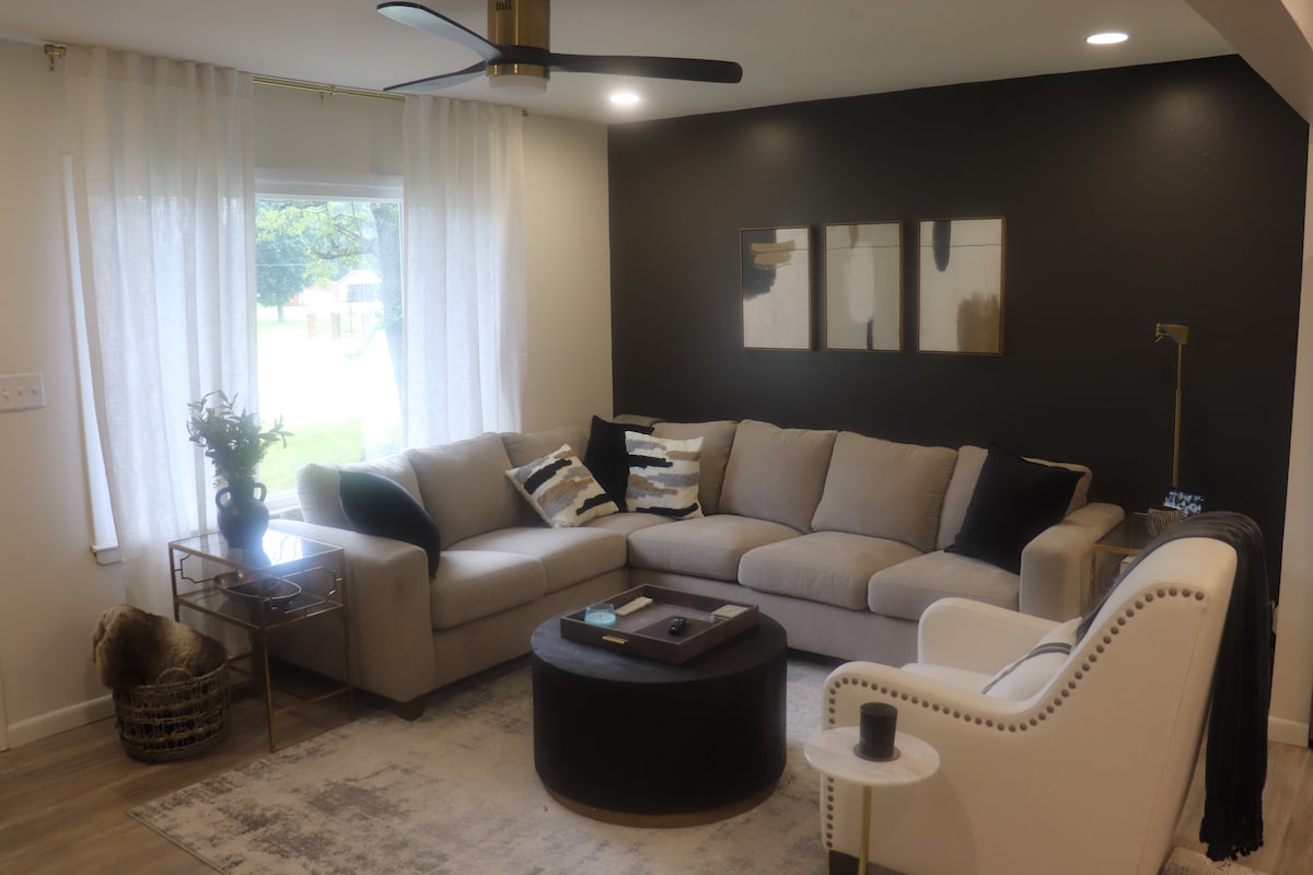Détendez-vous dans ce logement unique. Maison de 2 000 pieds carrés entièrement rénovée avec une belle vue sur la rivière, 3 chambres, 2 chambres familiales, 2 salles de bain complètes, cuisine entièrement équipée. La cour arrière est clôturée avec une terrasse, une table de patio et un planeur. Cette propriété est située à quelques pâtés de maisons du centre des congrès d'Owensboro, du musée Bluegrass et de plusieurs restaurants du centre-ville. Cette propriété jouxte le parc English. Excellente location pour un week-end d'aventures au centre-ville ou tout simplement pour profiter de la vue sur la rivière.