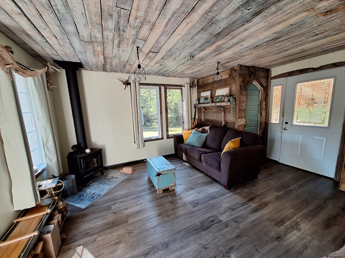Détendez-vous lors de cette escapade unique et tranquille. Cette simple cabane d'une pièce vous aide à ralentir et à profiter des petites choses. Entouré de forêt avec la propriété allant à la rivière voisine, c'est un endroit idéal hors réseau pour se détendre. Il dispose également d'un coin salon fermé. Il y a un vestiaire/toilette qui a une toilette portable avec chasse d'eau. De nombreux détails de cette cabane sont faits en bois flotté, d'où son nom « The Driftwood Cabin »