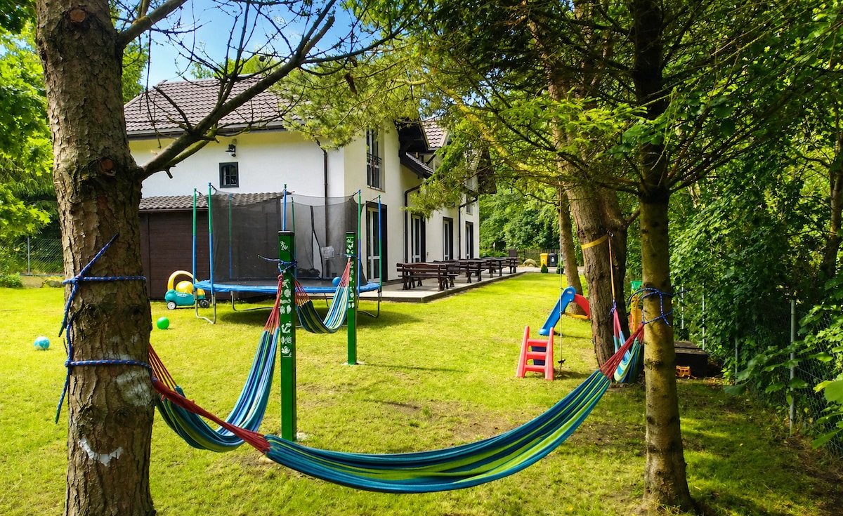 Surplombant la forêt, c'est plus paisible. Nous avons une belle maison avec de grandes fenêtres, un lac à proximité, une détente dans un hamac et des champignons à l'extérieur de la fenêtre. Pour les plus petits, nous avons des bacs à sable, du chewing-gum de jeu, un but de balle, ainsi qu'un terrain de volley-ball. La zone clôturée est parfaite pour les animaux de compagnie.