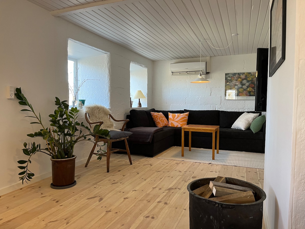 Si vous voulez découvrir le Danemark sous son aspect beau et calme, alors « Vidkærhøj » est l'endroit pour vous. La maison fait partie de notre propriété datant des années 1870, et était à l'origine une ancienne grange, que nous avons soigneusement rénovée au cours des dernières années. Elle est située entre Aarhus, Silkeborg et Skanderborg. Ici, les plafonds sont hauts et si vous le cœur vous en dit, notre chien, Aggie, vous saluera, tout comme nos chats, nos poules et notre coq qui sont également très curieux. Nous nous réjouissons de vous accueillir 🤗