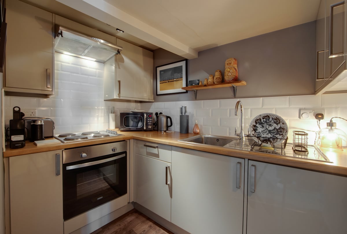 Ye Olde Cobbler - Appartement d'1 chambre à louer à Rye. Emplacement central au cœur de Rye, juste à côté de la rue principale. Avec une terrasse extérieure, vous pourrez profiter de la ville paisible sur votre propre petit bain de soleil ! Chambre double avec armoire, coiffeuse et miroir plein pied. Séjour avec deux canapés deux places et une télévision connectée pour votre confort. Cuisine entièrement équipée avec lave-vaisselle supplémentaire pour votre confort. Baignoire pleine grandeur avec douche aérienne dans la salle de bain pour vous aider à vous détendre complètement !