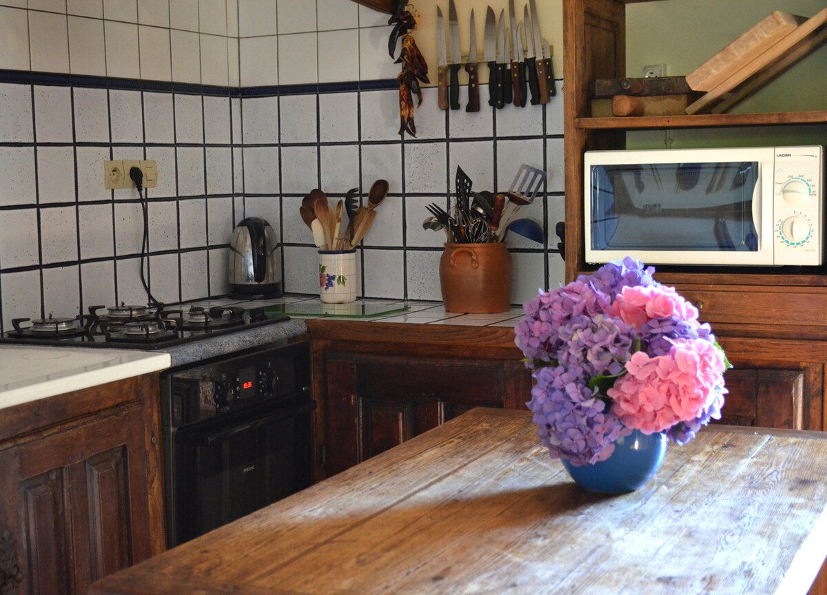 maisonnette calme, fraîche l’été grâce à l’épaisseur des murs et indépendante , mais à proximité des commerces , située sur la route des chemins de Compostelle , en bord de rivière , la Dordogne , à l'intersection de 3 départements Dordogne , Gironde et Lot et garonne . a mi parcours entre Montbazillac , Saint emilion et Duras , pays de vignobles et de chateaux. Convient pour un couple (chambre indépendante lit 140) et/ou couple avec un enfant ( banquette lit pour un enfant dans le salon)