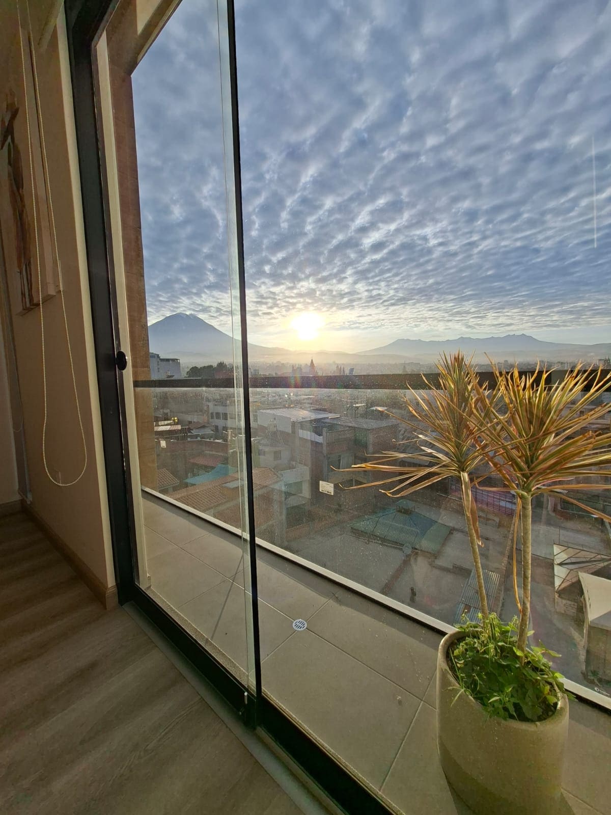 Modernidad y confort con vista al Misti🌋. Ideal para desconectar de la rutina o trabajo remoto. A 10 min del aeropuerto y zonas turísticas📍. Equipado con wifi, Netflix, cocina completa y agua caliente. Dormitorio con cortinas blackout para un descanso total. Incluye cochera interna🏎️ y acceso a Oxxo en el condominio🛒. Espacio desinfectado y seguro. 🚫 No mascotas / No fumar / No fiestas. Tu refugio funcional y privado en la ciudad.