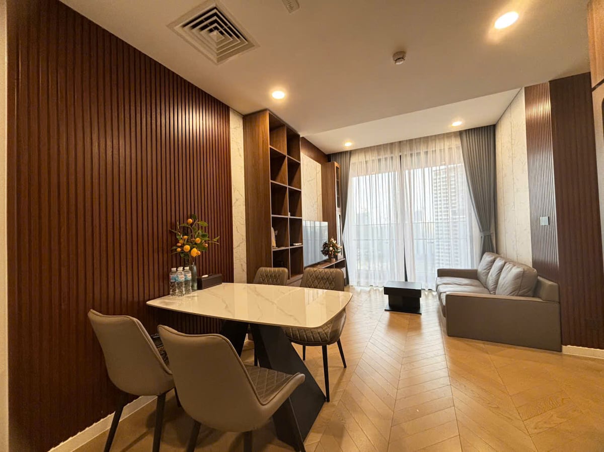 Gâtez-vous dans le luxe en explorant l'incroyable SG !Tout cet appartement de 1 chambre sera votre retraite de la ville toujours animée de Hô Chi Minh-Ville,mon appartement se trouve bien au-dessus de l'agitation de la ville. Vous pourrez vous détendre près de la piscine à débordement sur le toit ou vous entraîner dans la salle de sport bien équipée. Les deux sont gratuits ! Sortez, et vous serez au centre de tout :restaurants, cafés, cuisine de rue, mart et vie nocturne. Les attractions touristiques du district 1 sont à seulement 3 minutes en voiture ou à quelques pas de l'autre côté de la rivière SG.
