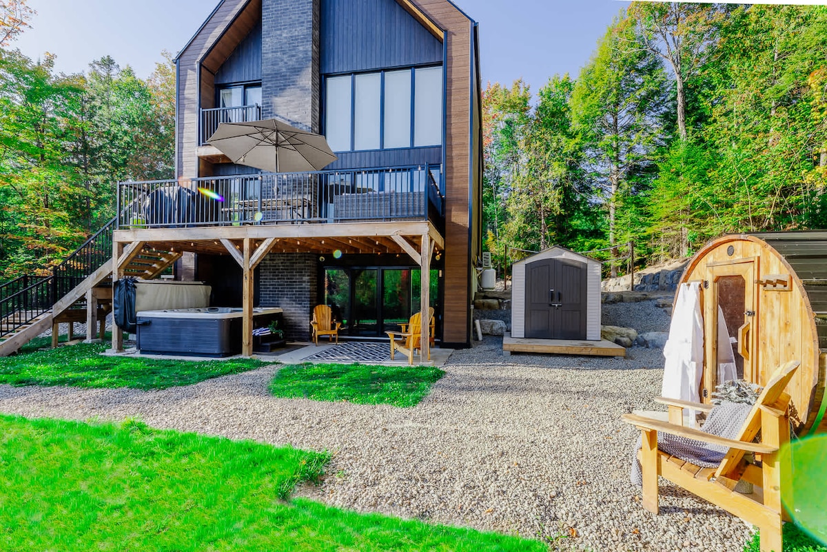 Chalet de type scandinave à Lac-Supérieur, Qc. CITQ# 300328 Situé à 300 mètres du magnifique Lac-Supérieur, ce Spahaus est une combinaison parfaite de la nature en raison de son emplacement en forêt et de sa modernité avec ses magnifiques espaces ouverts intérieurs, son jacuzzi extérieur, son sauna intérieur et bien plus encore! - Situé à 7 minutes de la station de ski Mont-Tremblant Versant nord. - Situé à 20 minutes du village Mont-Tremblant.