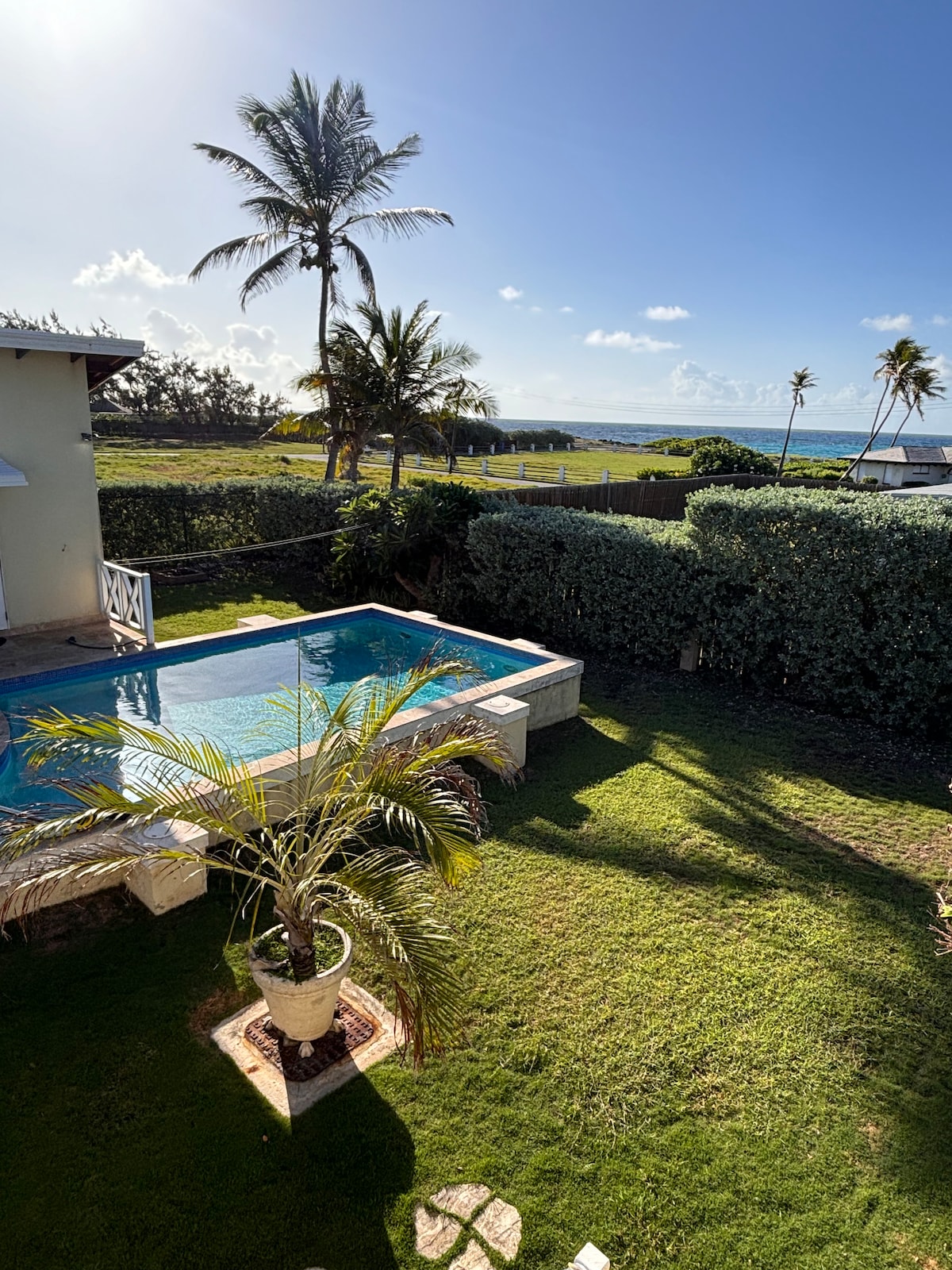 The villa on a cliff edge of the Atlantic ocean in a quiet and secure sea side residential neighborhood near Crane resort. There are 3 en-suite bedrooms, each of which feature an incredible view of the ocean. Two levels of terrace open upon the private pool overlooking the Atlantic. Cool breezes provide comfort year round. Fantastic sunrises with your morning coffee and shaded splendor for evening cocktails and grilling. Modern and comfortable for a relaxing holiday.