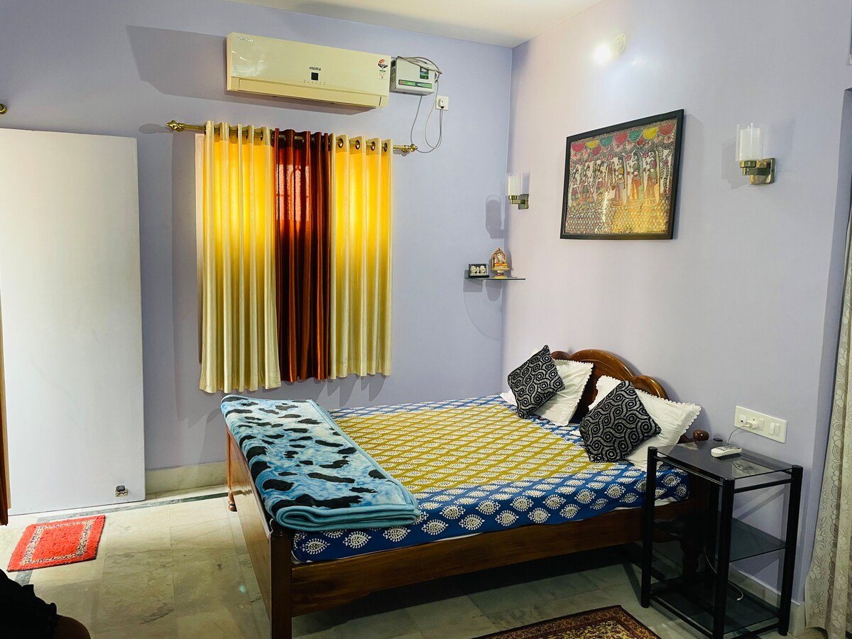 Chambre spacieuse entièrement meublée (530 pieds carrés) située à Laxmi Nivas, Chakratirtha Road, Puri. Idéalement situé : à 1 min à pied de la plage et à 10 minutes en voiture du temple Shree Jagannath. Chambre au 1er étage - pas d'ascenseur Parfait pour les couples, les amis ou une famille de 3 personnes. Cuisine (petit déjeuner, thé, réchauffage des aliments), Wi-Fi, climatisation, 1 lit double et lit simple, geyser, balcon, table à manger. Alimentation de secours disponible. Stationnement - sous réserve de disponibilité. Besoin d'en informer à l'avance. Location de vélos/voitures disponible à proximité
