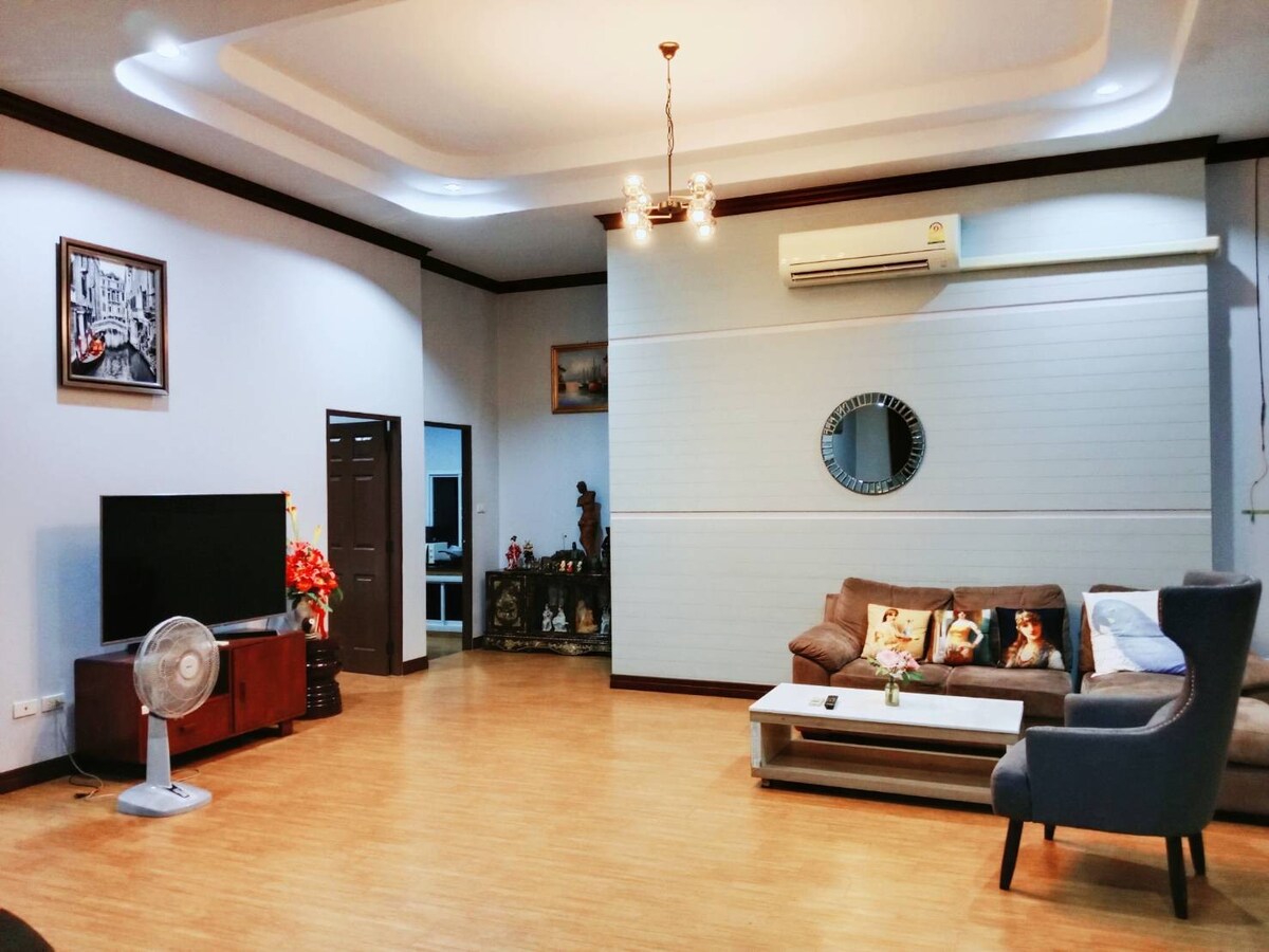 Maison avec une grande pelouse, des jardins fruitiers et fleuris ✅️Calme, ombragé ✅️Situé en plein centre-ville, près de l'autoroute, trajet pratique et rapide, route principale à 8 voies ✅️Entouré d'installations complètes ✅️Convient au travail à domicile et aux vacances ✅️Détendez-vous, à proximité de la nature autour de la maison et avec vue sur les montagnes ✅️Entouré de nombreuses attractions touristiques populaires telles que la mer et les plages populaires, les aquariums, les musées des tortues de mer, HTMS Chakri