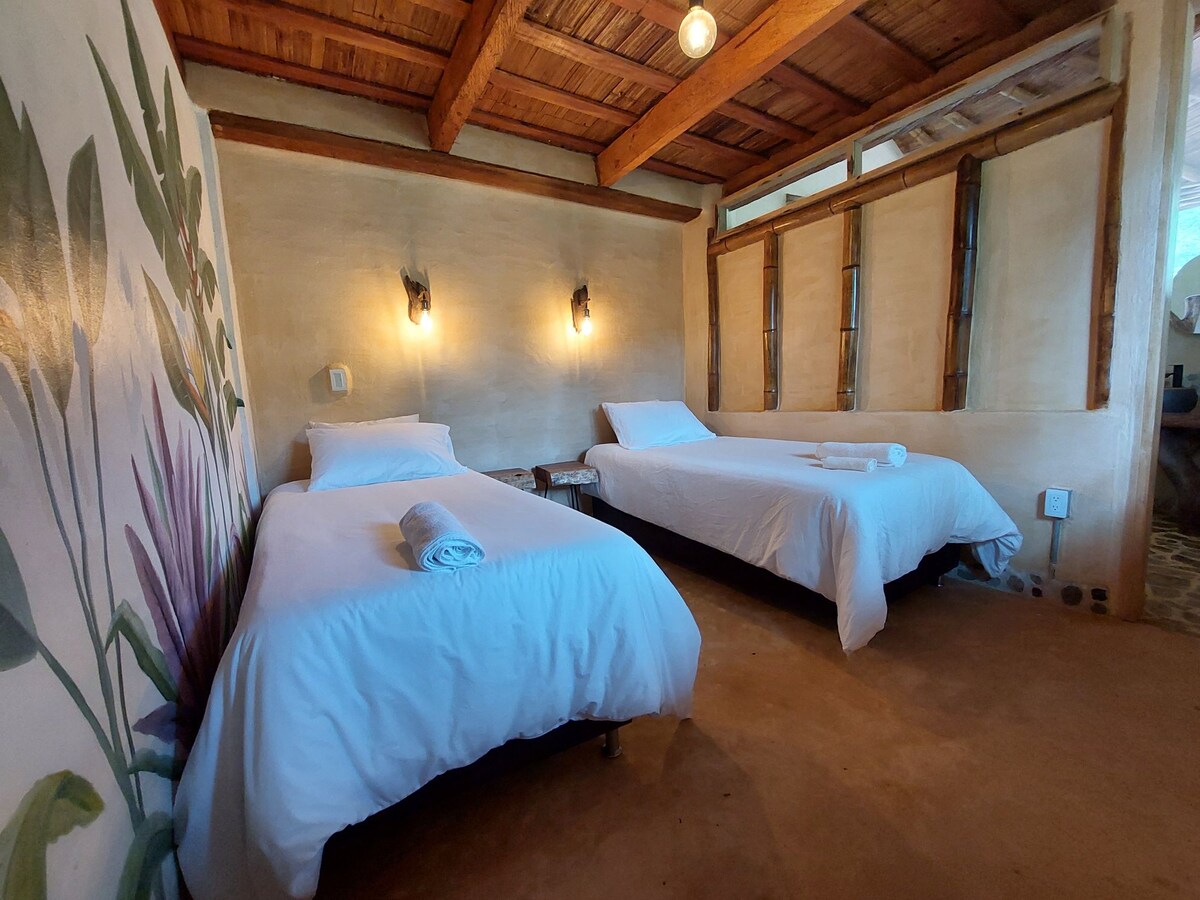 Dormez en écoutant le son de la rivière, réveillez-vous avec celui des oiseaux ! La chambre est une chambre en bambou, est à 20 mètres de la rivière et dispose de 8 lits simples. Il fait partie d'un hôtel à San Rafael, lieu unique de température parfaite entre 23 et 28 degrés, entouré de cascades et de rivières où se baigner. L'endroit est habité par des oiseaux de couleurs incroyables et est parfait pour les observations. Il y a des toucans, des reptiles et notre propre faune, chatte, chienne, poules, canards et jument :)