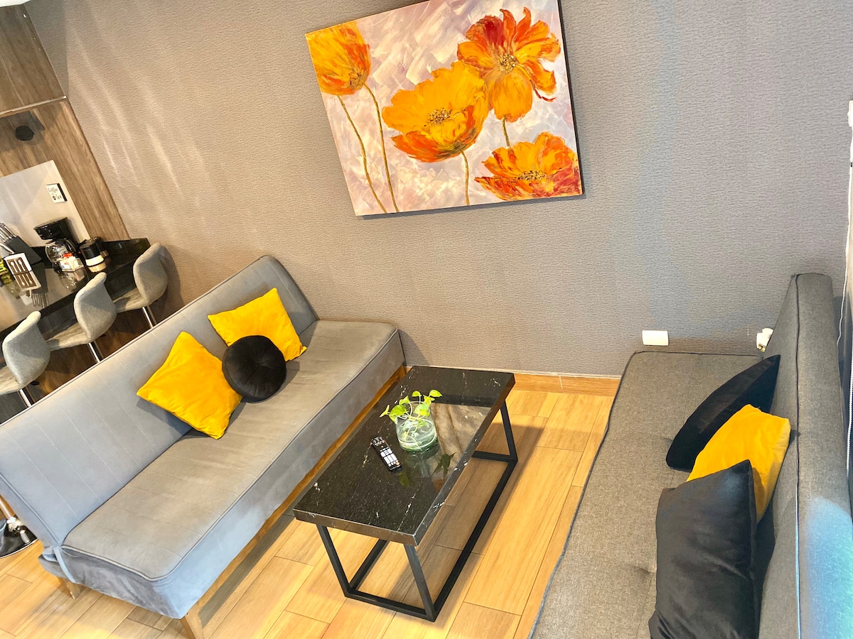 Appartement de 1 chambre, 1 salle de bain, canapé-lit, lit simple pliant très confortable, cuisine en quartz équipée, buanderie, bar à café avec ses fournitures respectives, WiFi, balcon avec vue sur le parc Fundidora et l'Arena Monterrey. Il dispose d'une salle de sport, d'un espace extérieur, d'une salle de jeux, d'espaces de co-travail et de barbecues (ce dernier est réservé pour des frais de ménage modiques). À quelques pas des meilleures attractions de Monterrey. Économisez du temps et de l'argent en séjournant à Depa Arena et Fundidora !