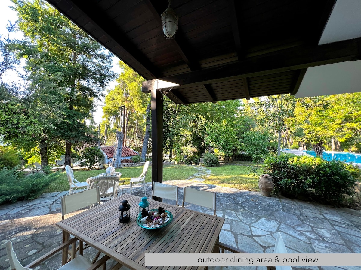 Sani est un village balnéaire animé connu pour son festival d'art estival, avec des concerts de musique folklorique et pop autour d'une colline voisine, surmontée par la tour Stavronikita du XVIe siècle. Sur la côte voisine, il y a plusieurs stations balnéaires, tandis qu'un court chemin à travers les pins mène à une zone plus calme de sable et d'eau peu profonde. La maison est traditionnelle et située dans la forêt à 700 mètres de la plage. C'est un endroit pour se détendre et profiter de la nature.