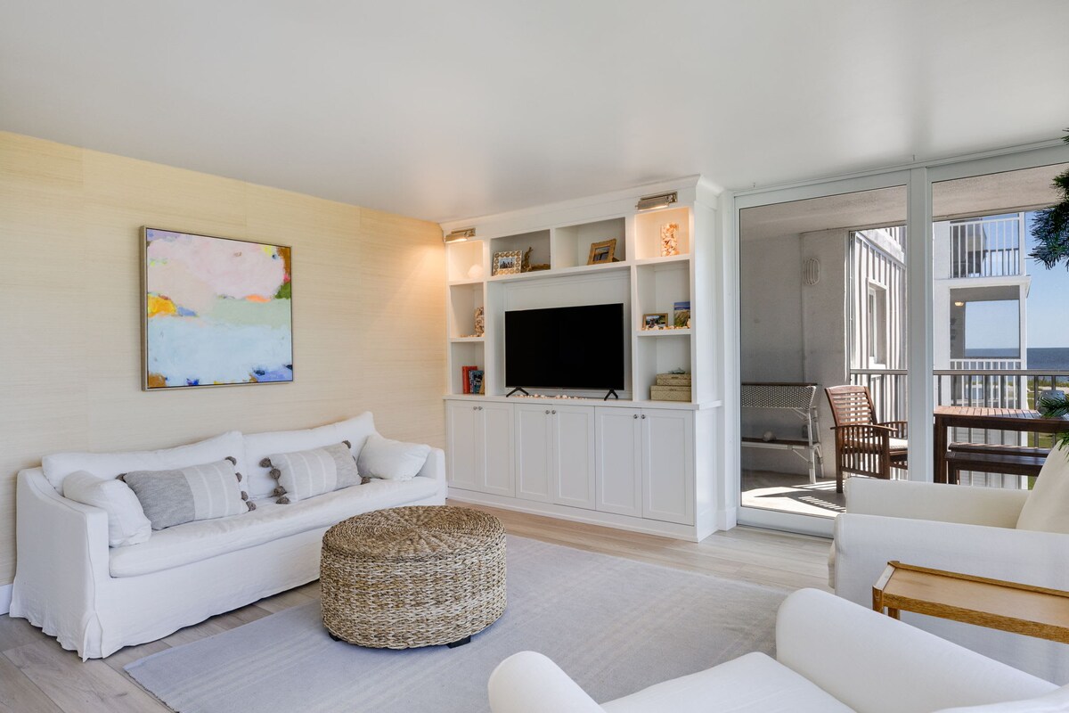 Sur la plage avec vue sur l'océan au dernier étage ! Profitez d'une vue imprenable sur l'océan depuis cette retraite côtière relaxante, à quelques pas de la plage. Ce grand condo peut accueillir 4 personnes et a été entièrement rénové pour inclure une cuisine personnalisée agrandie et une salle de bain de luxe avec une grande douche à l'italienne. Mobilier côtier haut de gamme dans chaque pièce. La chambre principale spacieuse offre une vue sur le golfe, un lit king size et un bureau grand format si vous avez besoin d'un espace calme pour travailler. Le Wi-Fi a été entièrement mis à niveau pour faire du streaming et de la vidéo un jeu d'enfant.