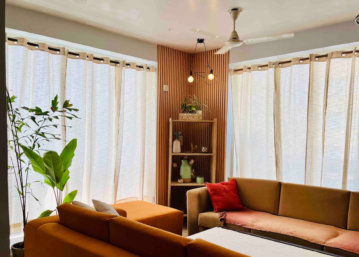Séjournez dans notre spacieuse retraite de 2 chambres avec vue sur le parc, à 8,5 km des aéroports et à 15 min en voiture du métro. Profitez de balcons aérés, de vues sur le parc, de lits en acajou/bois, d'une cuisine entièrement équipée, d'une connexion Wi-Fi haut débit, d'une télévision connectée, d'articles de toilette gratuits et de recommandations locales. Savourez des repas faits maison, explorez le marché et les centres commerciaux à proximité et détendez-vous sur les pistes de jogging sereines. Découvrez une hospitalité haut de gamme avec une arrivée et un départ flexibles, des services de blanchisserie et des transferts aéroport en option. Réservez dès maintenant pour un séjour inoubliable à Delhi !