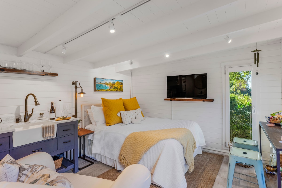 Nestle into nature in a cozy cottage in the mountains between the beaches of Santa Barbara & foodie filled wine region, Santa Ynez Valley. (About 30 minutes to each) Sweet private space for 1-2 guests with a luxurious king bed, equipped kitchenette with counter seating, hot tub under the oak trees, outdoor deck for evening sips surrounded by mossy boulders and a star studded sky. Enjoy the neighborhood’s ocean and mountain views, explore nearby hikes, savor local wine, and dine out well!