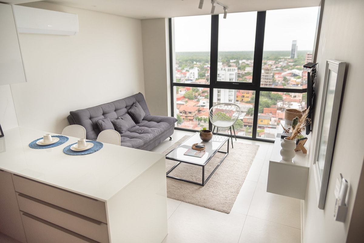 Profitez de cet appartement moderne au 15e étage avec une vue spectaculaire depuis son balcon. Idéal pour les voyages d'affaires ou les escapades, il dispose d'une cuisine équipée, de vaisselle, d'un canapé-lit, d'un lit de 2,5 places, d'une télévision de 50", d'une serrure intelligente. La copropriété offre un espace de coworking, une salle de cinéma, une salle de sport intelligente, une piscine sur le toit, un barbecue et une cuisine équipée pour un usage commun. Situé à Equipetrol, la meilleure zone de SCZ.