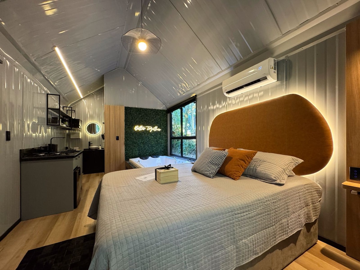 Relaxe neste lugar único, aconchegante e tranquilo, em meio à natureza. Nosso Bangalô Sonho está localizado na área rural, distante apenas a 4,5 km do centro da cidade. O espaço possui cama queen, SmartTV 32", ar condicionado inverter, secador de cabelo, chuveiro a gás, torneiras com água quente, uma cozinha equipada com frigobar, microondas, cooktop, torradeira, chaleira elétrica e utensílios domésticos. Temos Wi-Fi. As paredes possuem isolamento térmico. Não é permitido Pet.