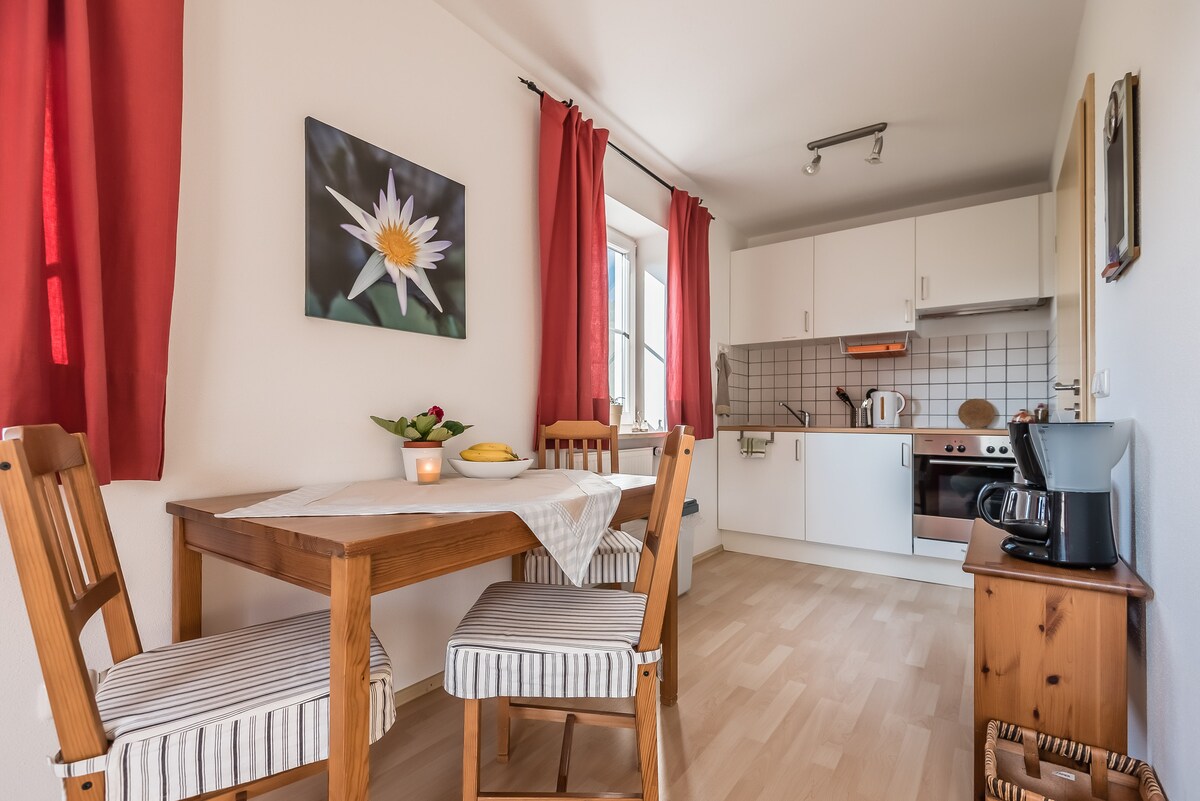 Mon logement est d'environ 33 m² plus balcon, il est situé à proximité du centre-ville et des transports en commun. Vous allez adorer mon logement : confort bavarois, un lit confortable (140 x 200), une cuisine bien équipée, la cheminée, un balcon spacieux et couvert, le calme, bien sûr les montagnes et les lacs... Mon appartement décoré avec goût est toute l'année un refuge romantique pour les couples, les voyageurs en solo, les aventuriers et les voyageurs d'affaires.