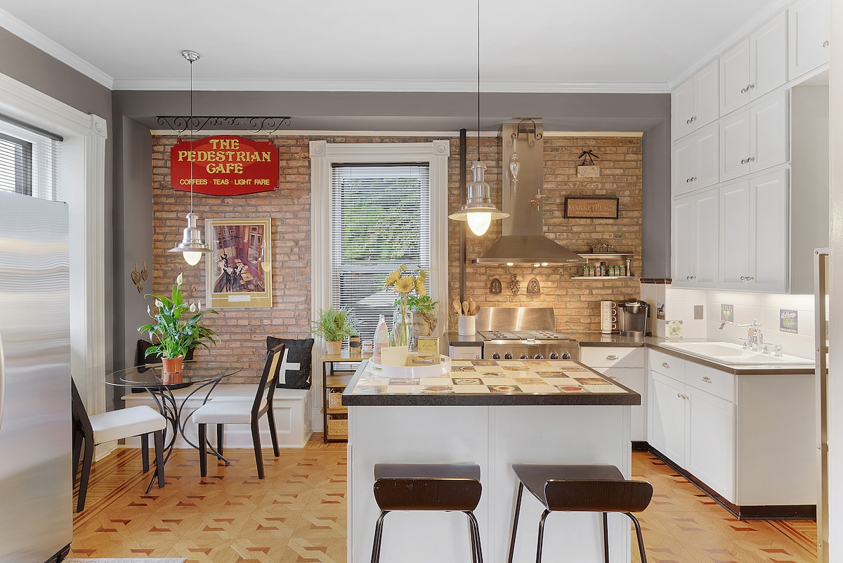 Bienvenue à The Farmhouse au 10 Park Place - Un appartement unique de 1 chambre au premier étage. Cet appartement a reçu le traitement complet : tout est neuf ! Asseyez-vous et détendez-vous devant la cheminée tout en profitant de la télévision connectée de 55 pouces ou d'un bon livre. Une cuisine complète permet aux voyageurs de préparer un repas complet et la table à manger avec 4 places permet aux voyageurs de s'asseoir pour en profiter. La chaise longue se transforme en lit complet pour un 2e espace de couchage. Toutes les commodités du centre-ville sont à quelques minutes à pied.