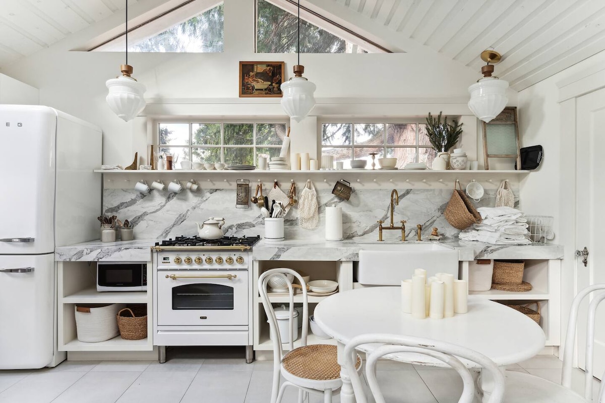 Quiet, clean, self-contained 400 sf studio in a modern home with full bath, kitchen, private entrance and secured parking with EV charger. Comfortably furnished with 1 queen bed, 1 full sleeper sofa, office desk, media center, fridge with ice dispenser, stove, curb-less shower, bidet, washer and dryer. Large sliding glass doors to a patio and 150' high cedar, madrone trees. Effortless access with no stairs or steps. Warm radiant water heated concrete floors, AC and plenty of ventilation.
