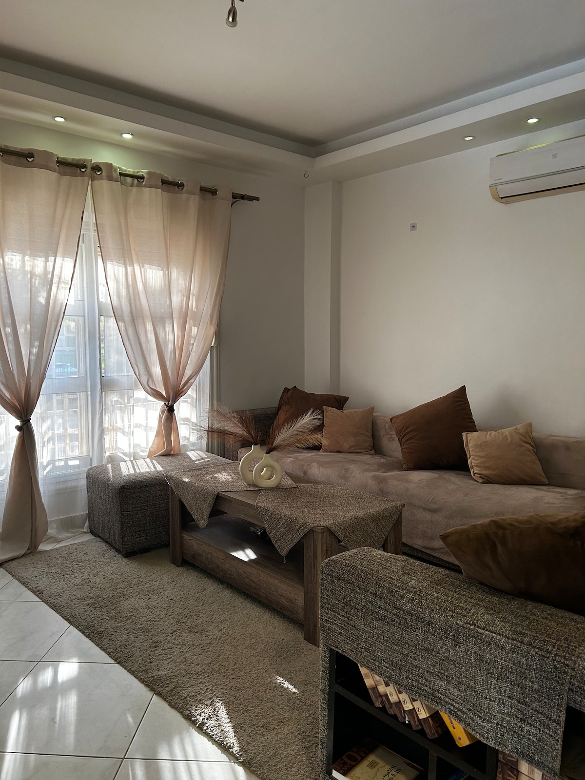 Keep it simple at this peaceful, garden attached and centrally-located place. This 2-bedroom flat offers: large reception with a Samsung the frame TV. - *Master Bedroom* with a queen-size bed & large closet - *Second Bedroom* with a couple of single beds.Fully Equipped Kitchen* with all essentials. Air conditioning in every room, and Egyptian cotton linens for a luxurious sleep.Nestled in a calm, green neighborhood just 25 mins from Cairo Airport, and near to the open air mall of Madinty.