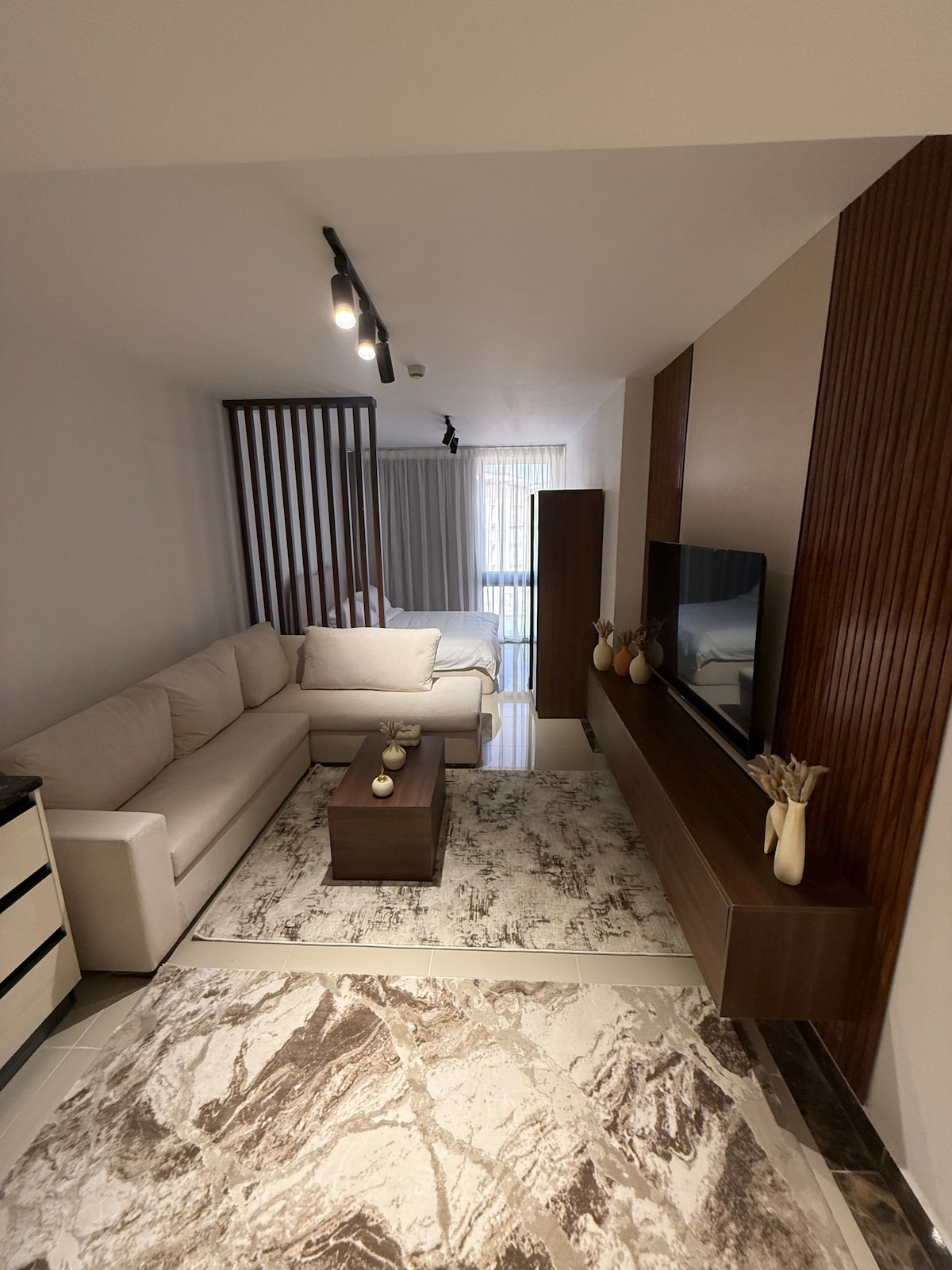 Un studio confortable avec une chambre, un lit king size, une salle de bain et un salon avec un mobilier magnifique et élégant, à proximité de tous les services.