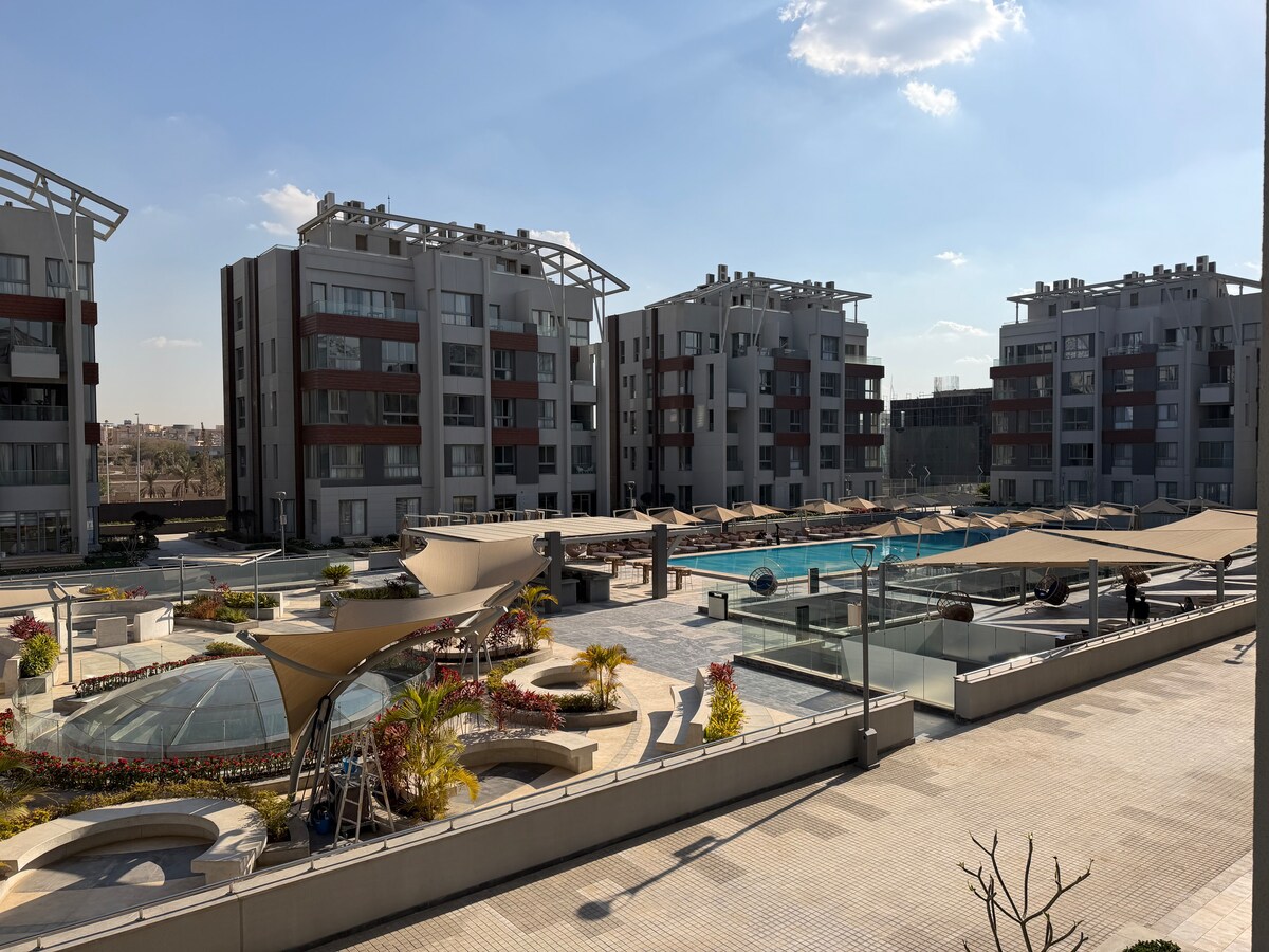 3 bedroom, 3 bathroom apartment with modern design and furniture to give you the loft feeling you yearn for. designated work spaces is the apartment where you find comfortably with unique pool and landscaping view , Have fun with the whole family at this stylish place. Near by Destinations Airport - 20 min 01 mall - 1 min Garden 8 mall - 10 min CFC mall - 15 min 5A mall - 20 min Maadi - 40 min Down town - 45 min Grand Egyptian Museum (GEM) - 45 Min