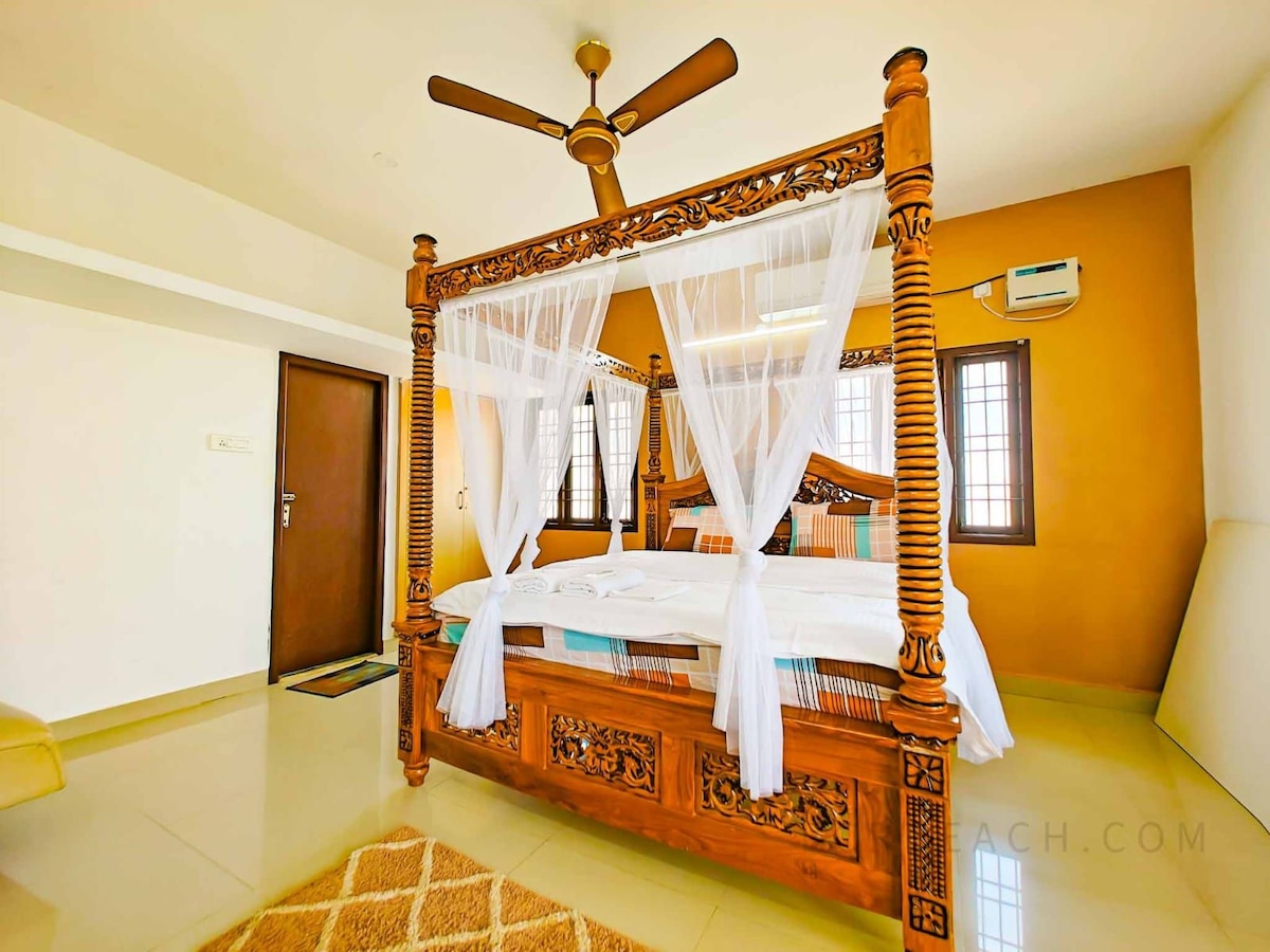 Ce que vous aimerez dans notre maison de plage : Climatisation centralisée pour vous garder au frais et à l'aise. Piscine privée : votre propre oasis pour des baignades rafraîchissantes et une ambiance ensoleillée. Cuisine entièrement fonctionnelle – équipée avec tout ce dont vous avez besoin pour préparer de délicieux repas Couchages confortables : 2 chambres avec lits moelleux, Canapé-lit pour voyageurs supplémentaires, matelas supplémentaires Divertissement à vos doigts : télévision connectée avec Netflix, abonnement Prime Video et Hotstar, Wi-Fi haut débit pour la diffusion en continu