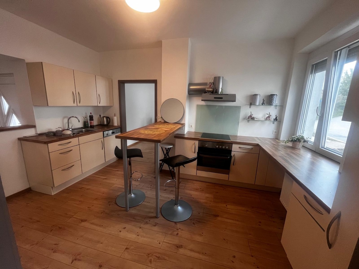 Cet appartement de 100m2 en mezzanine vous offre deux chambres (1 avec un lit double, 1 avec un lit superposé), un grand salon avec un canapé-lit double, une grande cuisine avec un poêle à granulés et un accès au jardin d'hiver. Vous y trouverez également une salle de bain avec baignoire, chauffage au sol, lave-linge et sèche-linge. Séparément des toilettes.