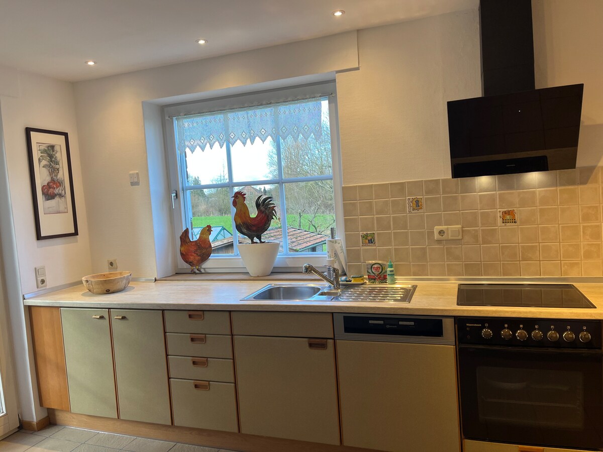 Nous proposons un appartement dans notre petite ferme. L'appartement fait environ 32 m², une petite cuisine (sans plaque de cuisson) et une salle de douche... il est complètement indépendant, avec des sièges à l'extérieur. Le bus et le supermarché sont à proximité immédiate et le centre-ville est à environ 20 minutes à vélo. Parking gratuit sur la propriété Cuisine : réfrigérateur avec compartiment congélateur, machine Nespresso, grille-pain, micro-ondes) Confort 160x200 Un lit bébé/lit bébé peut être réservé en plus pour 10 €