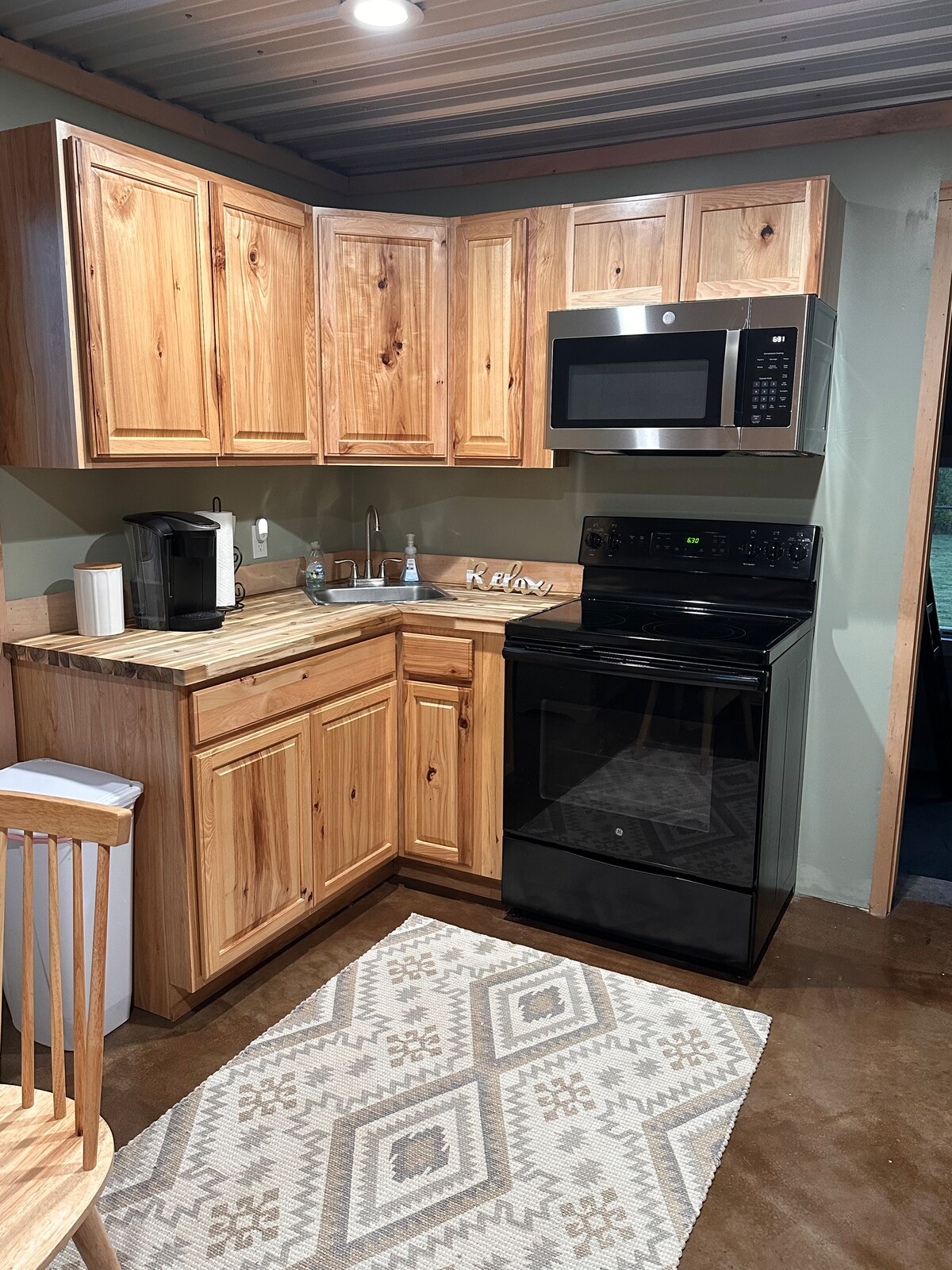 Cette maison a été construite à partir de bois récupéré de la région. La maison a un haut plafond ouvert et un escalier en bois menant au balcon, des planchers de chêne personnalisés (également fabriqués à partir de bois récupéré). Le lit principal est complet avec une salle de bain principale avec une immense douche en pierre faite de pierres de ruisseau locales. À l'étage, il y a un lit King Size, une salle de cinéma de 120", des sièges supplémentaires. Le porche arrière pleine longueur mène au jacuzzi. Elle est vraiment unique en son genre.