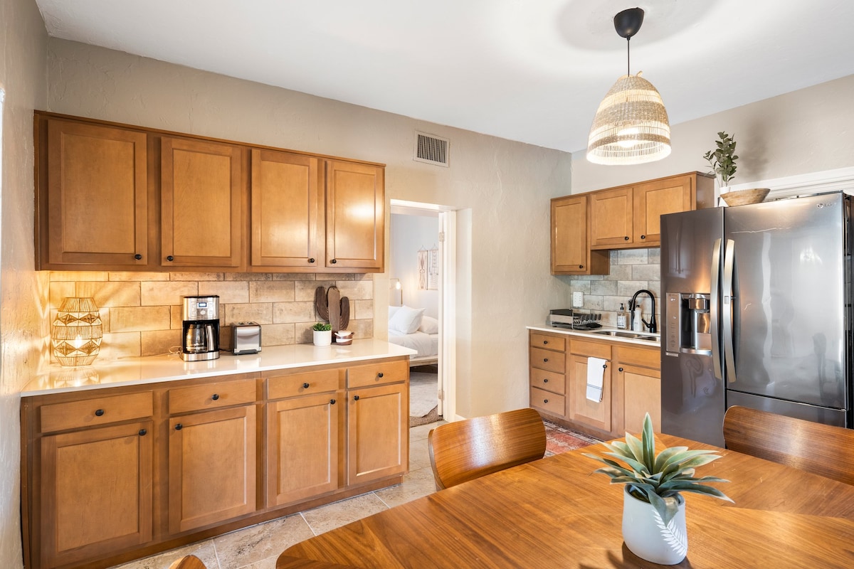 Stunning Studio Casita! Custom New build with an Open floor plan, Bright and cozy and in a wonderful, walkable, Downtown Tucson Neighborhood. Walking distance to A Mountain, Annex, Mercado San Agustin, Streetcar, The Loop bike path, UofA Campus 2.5 miles, Art & Music venues, Saguaro National Park, Restaurants and Nightlife. -Tile floors -Cathedral ceilings with Beams -Luxurious Kitchen with Quartz countertops -A/C - Queen size bed - Smart TV - WIFI -Washer/Dryer -Enclosed yard -Pet Friendly