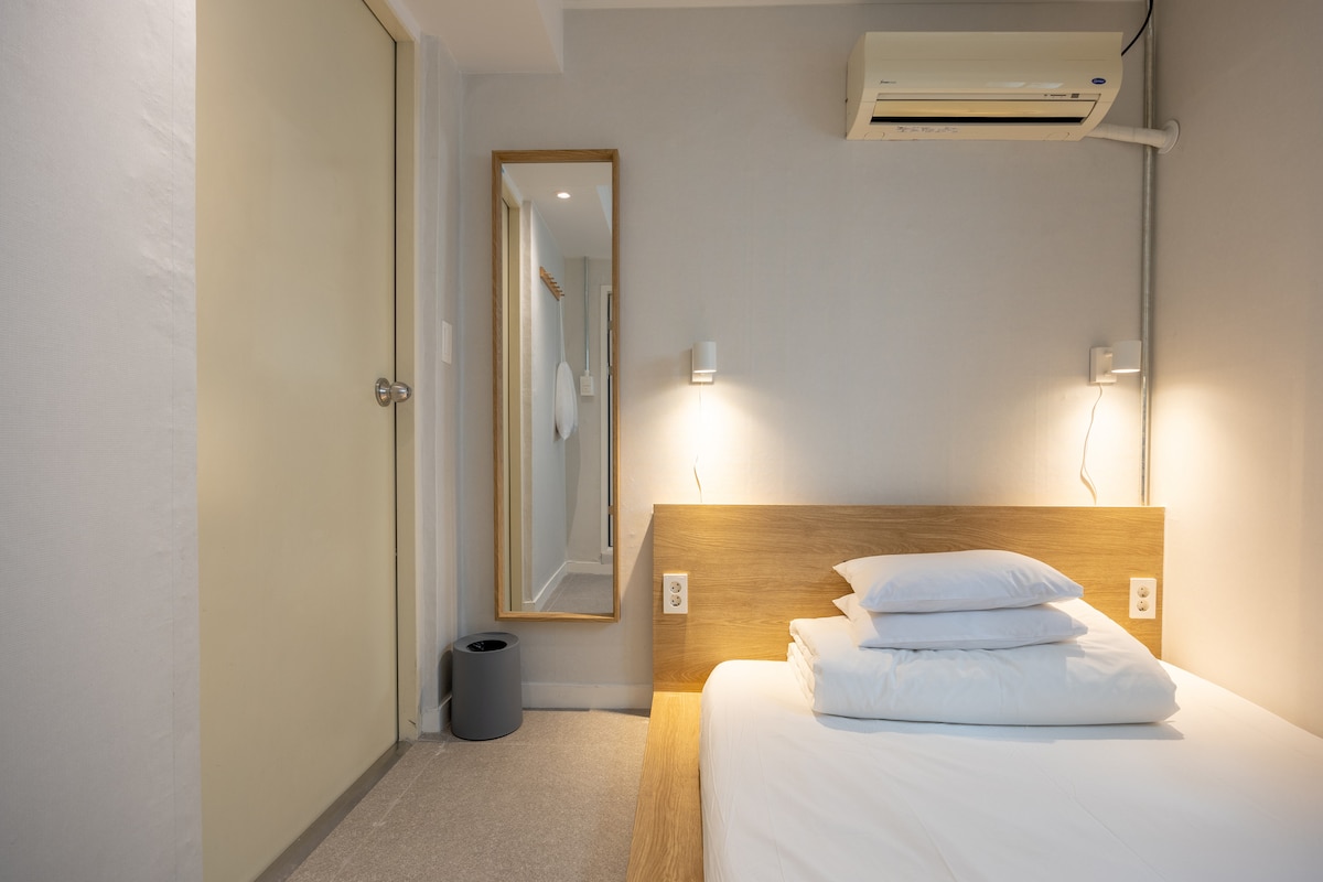 [New Open] ● Séjournez à Sai [1 chambre] -. Nombre maximum de personnes : 1 -. C'est un espace soigné et confortable pour rester seul. (Il y a une salle de bain séparée) -. Il n'y a pas d'ascenseur et une seule chambre est attribuée au hasard aux 1er et 2e étages :) -. Il est situé juste en face du marché chaud de Gwangjang et à 3 minutes à pied de la station de métro Jongno 5-ga. -. Vous pouvez emporter de délicieux plats au marché de Gwangjang et en manger dans un espace assez commun. -. Nous fournissons gratuitement 6 types de ramen coréens pour les voyageurs :) -. Il y a une cuisine assez commune où une simple cuisine est possible :) -. Appareils équipés : lave-linge/sèche-linge/réfrigérateur/micro-ondes/grille-pain/ustensiles de cuisine/ustensiles de cuisine/climatiseur et chauffage dans chaque pièce Nous utilisons la literie de ● l'hôtel et fournissons une literie propre qui a été stérilisée et lavée à chaque fois. C'est un logement sûr avec une quarantaine régulière par l'intermédiaire d'une entreprise professionnelle ● tous les mois :) C'est un logement propre où l'●hôte gère lui-même le nettoyage.