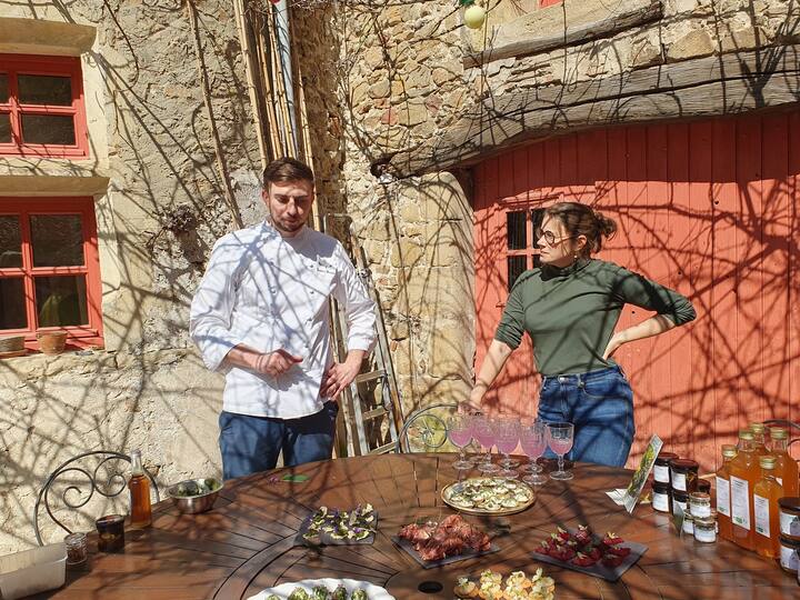 Je vous propose une cuisine qui sublime les produits simples, pleine de goût, locale, fraîche et créative. Mise en bouche surprise, entrée végétale de saison, poisson ou viande en cuisson douce, fromage affiné revisité, dessert gourmand signature.