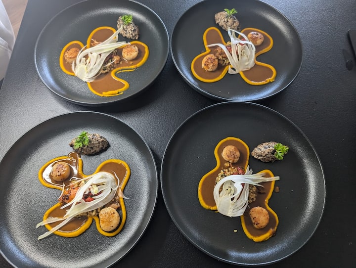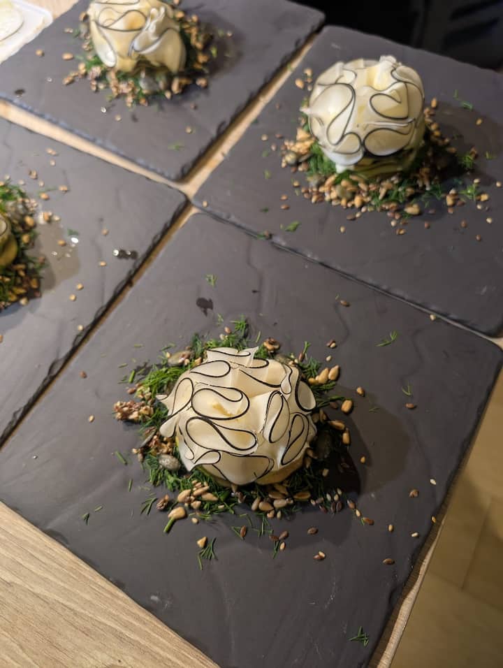 Un menu en 5 temps, inspiré des saisons et des produits du terroir. Chaque assiette est pensée comme une création unique, entre finesse technique et harmonie des saveurs. Une expérience digne des grandes tables, à domicile.