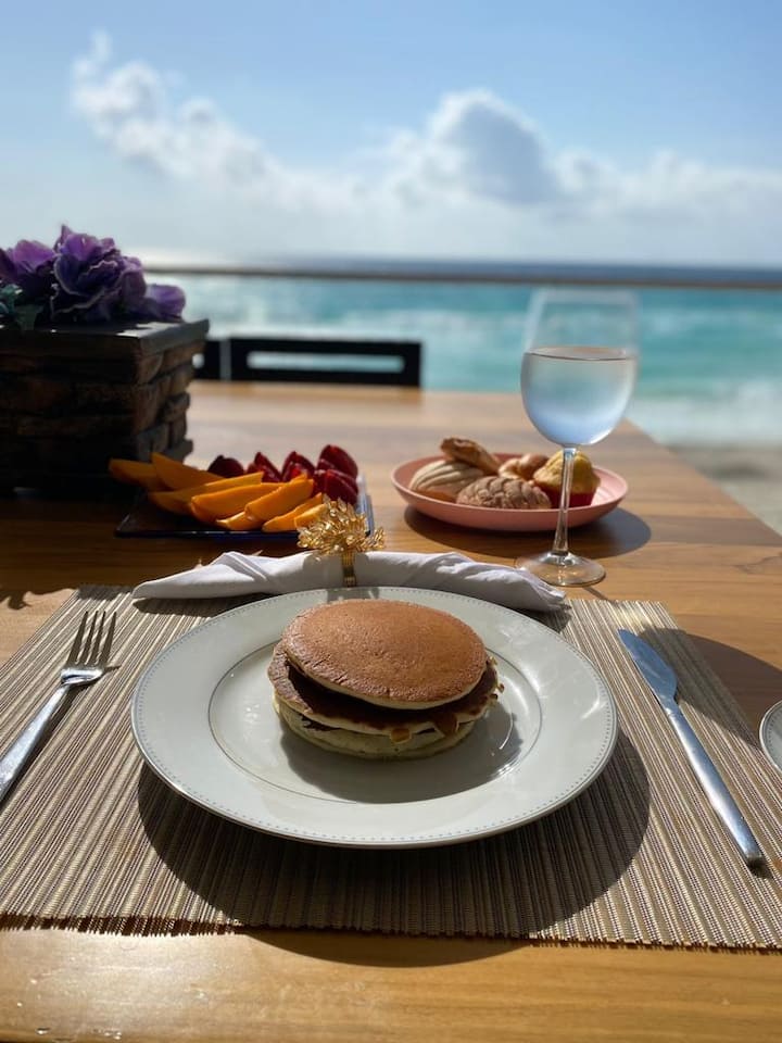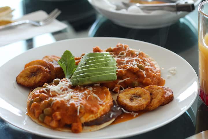 Au choix : œufs rancheros, œufs motuleños, chilaquiles ou burrito du nord, avec garnitures, café américain, crème, jus de fruits (selon la saison), pain grillé avec beurre et confiture ; tous les ingrédients sont inclus.