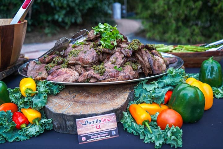 Nous vous proposons une expérience gastronomique cinq étoiles dans votre jardin, avec nos incroyables entrées de fruits de mer et nos viandes de qualité supérieure. Exemple de menu : chorizos argentins, crevettes géantes à l'ail et pétoncles, poulet au miel, hampe de bœuf et faux-filet de qualité supérieure (USDA Prime), servis avec des petites pommes de terre à l'ail et une salade maison. Nos viandes sont grillées au charbon de bois et au bois avec nos propres grils que nous apportons chez vous.