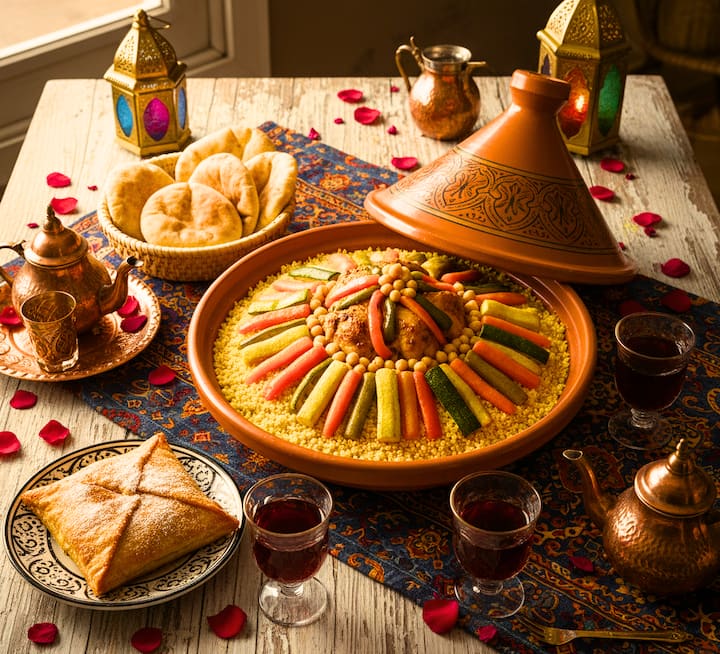Profitez d'une expérience culinaire arabe de rêve à Séville avec une sélection d'entrées comme le houmous à la truffe noire ou le taboulé, un premier plat comme le poulet au citron, le couscous ou le tajine. Les desserts comme la crêpe marocaine au miel de canne et aux fruits ou le riz au lait et à la cannelle. Aussi des bonbons arabes traditionnels comme la corne de gazelle ou la Chebakia.
