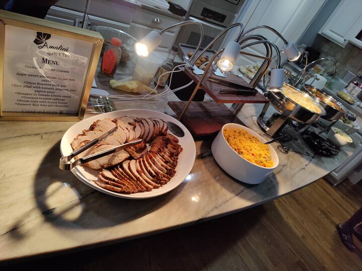 Profitez de ce repas complet comprenant 2 viandes, 4 accompagnements et un délicieux dessert. Du thé, de la limonade ou du punch peuvent être ajoutés. Veuillez nous informer à l’avance de toute restriction alimentaire.