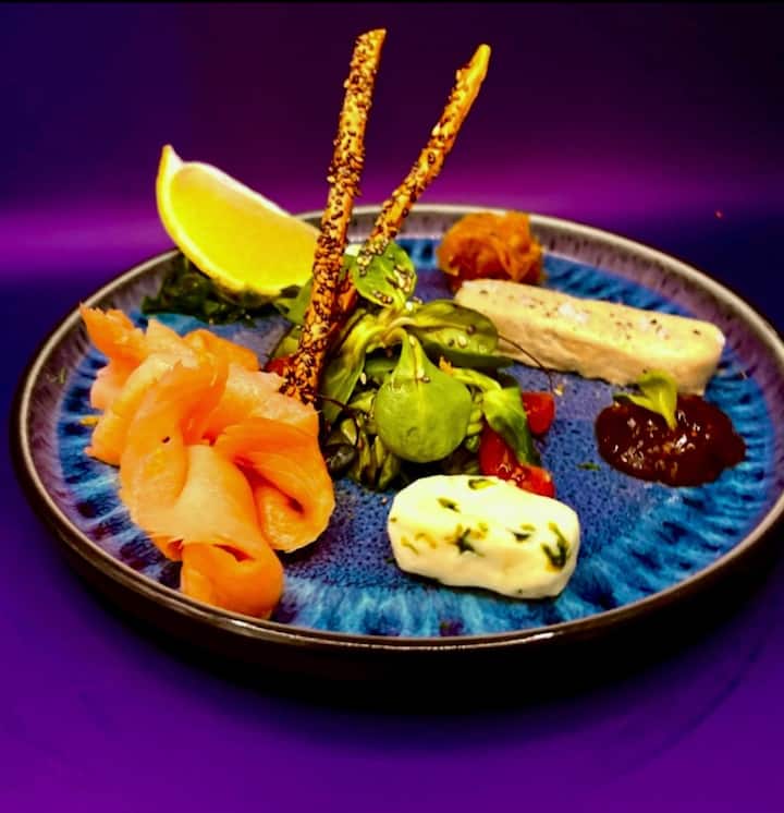 Assiette “ Terre & Mer ” Foie gras et saumon fumé accompagnés d’un florilège de toasts et condiments.