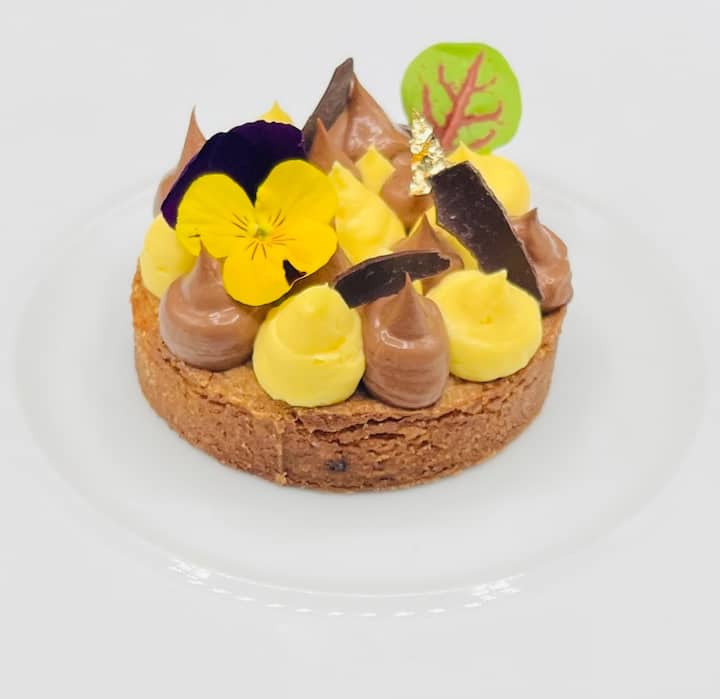 Tartelette Normande revisité au caramel beurre salé & crème d’Isigny sur Mer accompagné d’un espuma à la fève de tonka.